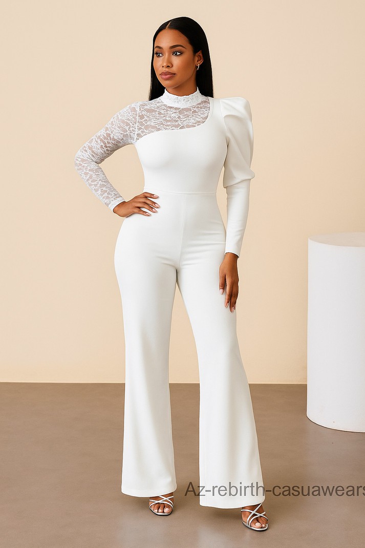 Step into sophistication with this stunning white jumpsuit, designed to flatter and impress. Featuring a unique one-sleeve style, the right sleeve is crafted from luxurious lace, adding a touch of romance, while the left sleeve is made from smooth crepe with subtle puff detailing at the shoulder. The high neckline and tailored fit elongate the silhouette, making it perfect for weddings, formal events, or special evenings.