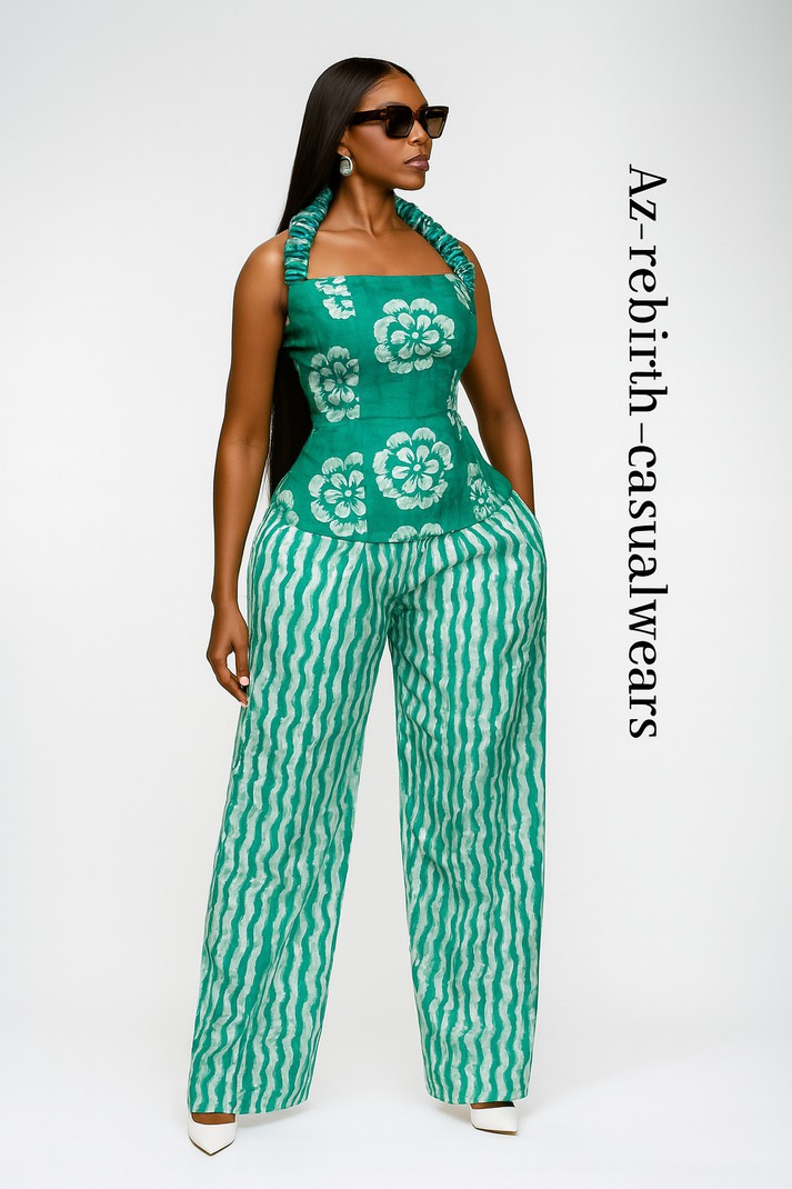 This beautiful two-piece set for women features a stylish halter top and matching palazzo pants, made with quality African print fabric. Designed to give a flattering and comfortable fit for any occasion.