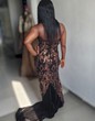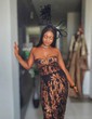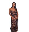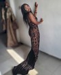 This piece is designed as a fitted bustier maxi dress with long fish tail. It features a zipper and tie-back.