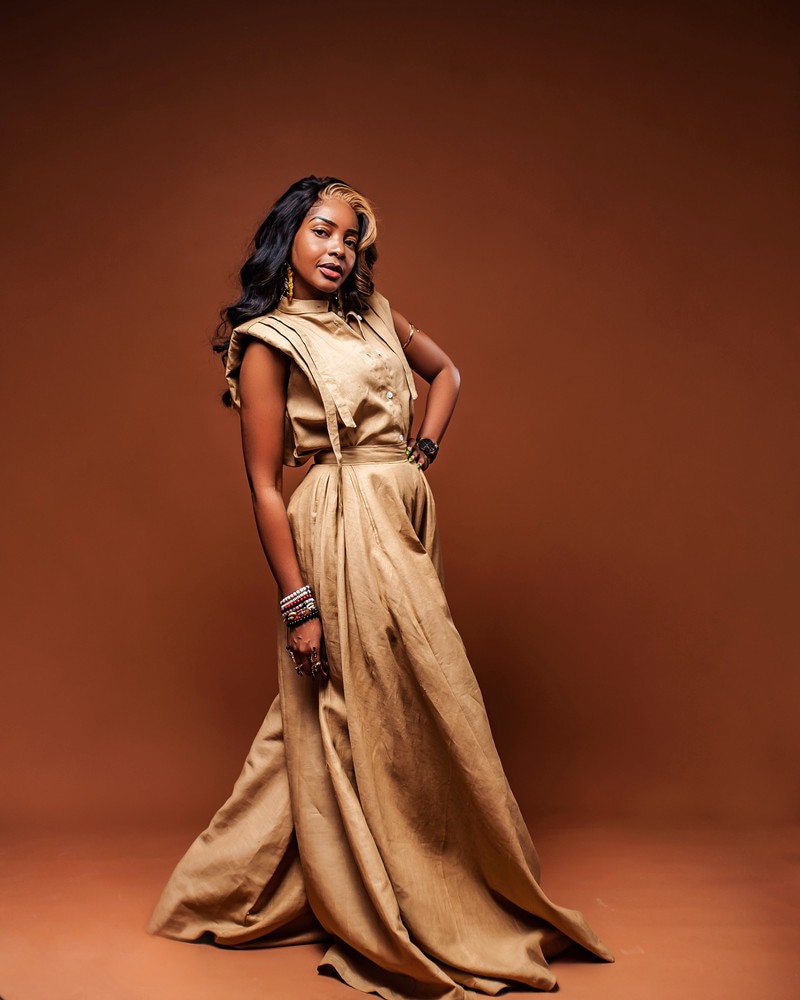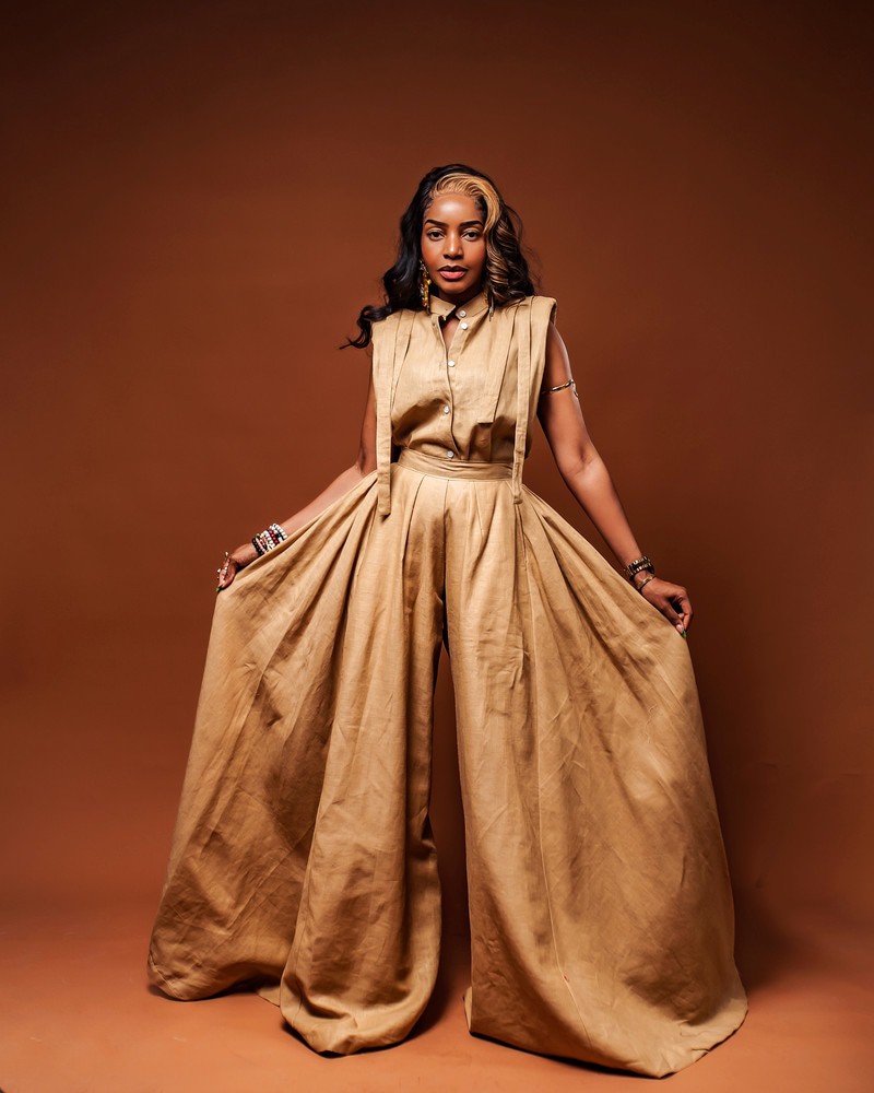 Ensmeble deux pièces en lin composé d'un pantalon taille haute extra large et d'une chemise démembrée à épaulettes. Cet ensemble est époustouflant et très imposant. Il vous donne de l'allure et communique l'assurance. Se porte aussi bien en journée qu'en soirée