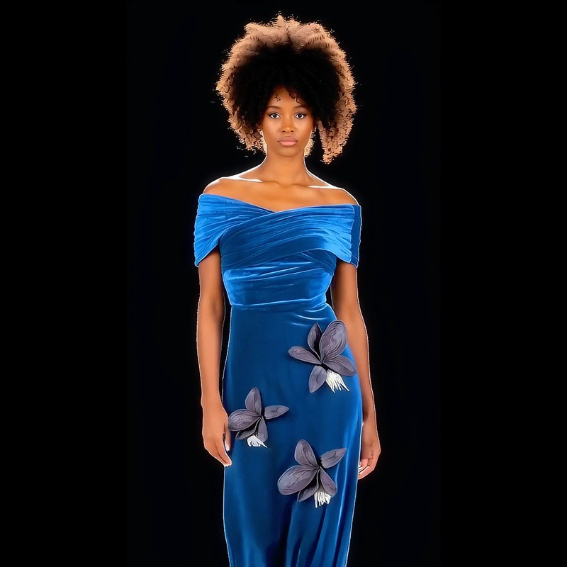 Commanding, sculptural, and exquisitely refined, the Katherina Maxi Cocktail Dress is crafted for moments that deserve to be remembered. This show-stopping silhouette pairs hand-embellished silk with sumptuous velvet, creating a rich interplay of texture and depth. Bold 3D petal appliqués bloom across the bodice, adding couture-level artistry, while the banded off-shoulder neckline frames the décolletage with effortless allure.