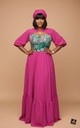Radiate elegance in this sophisticated maxi-length gown, a stunning fusion of modern tailoring and rich African heritage. The dress is meticulously crafted from premium pink crepe, chosen for its fluid drape and wrinkle-resistant quality, ensuring a flawless silhouette from day to night. At the heart of the design is a structured bodice featuring authentic hand-dyed Adire fabric in a mesmerizing emerald and violet pattern, framed by a chic crescent cut-out and feminine puff sleeves. This vibrant ensemble, complete with a matching headwrap, is the ultimate choice for high-profile weddings, gala events, or festive celebrations, offering a bold yet graceful look for the woman who values artisanal craftsmanship and contemporary style.