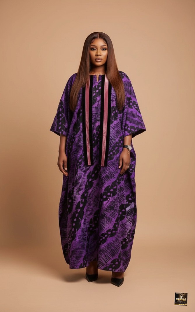 Embrace regal comfort with this floor-length Maxi Kaftan . It is crafted from a dark, flowing fabric featuring an intricate purple and black Batik print. The generous cut ensures a dramatic, comfortable drape. The focal point is the structured V-neckline, which is elegantly framed by three vertical strips of contrasting black and pale pink velvet trim, elevating this traditional garment into a statement piece suitable for formal occasions.
