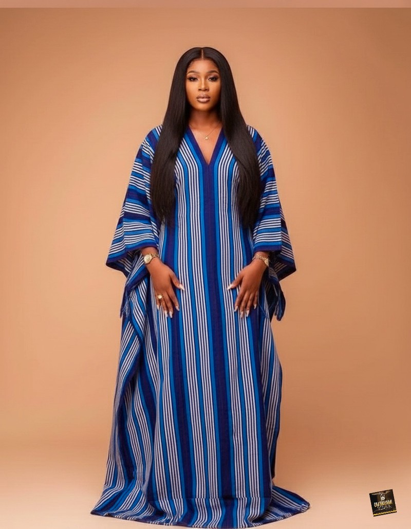 This striking, floor-length kaftan showcases a rich, rhythmic design created by bold vertical handwooven stripes in varying shades of blue and white, reminiscent of traditional woven textiles. The entire garment is patterned with alternating thick stripes of deep royal blue and thinner stripes of lighter blue and crisp white, creating a captivating visual flow that elongates the figure from shoulder to hem. The kaftan features a comfortable, generous silhouette with dramatic, wide-cut batwing sleeves that maintain the flowing, luxurious drape characteristic of the style. The neckline is a simple V-neck with a subtle slit, drawing attention to the verticality of the stripes. This richly patterned maxi kaftan effortlessly blends cultural inspiration with sophisticated comfort, making it a powerful and stylish statement piece for any occasion.