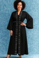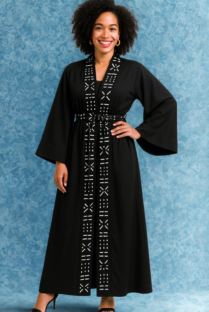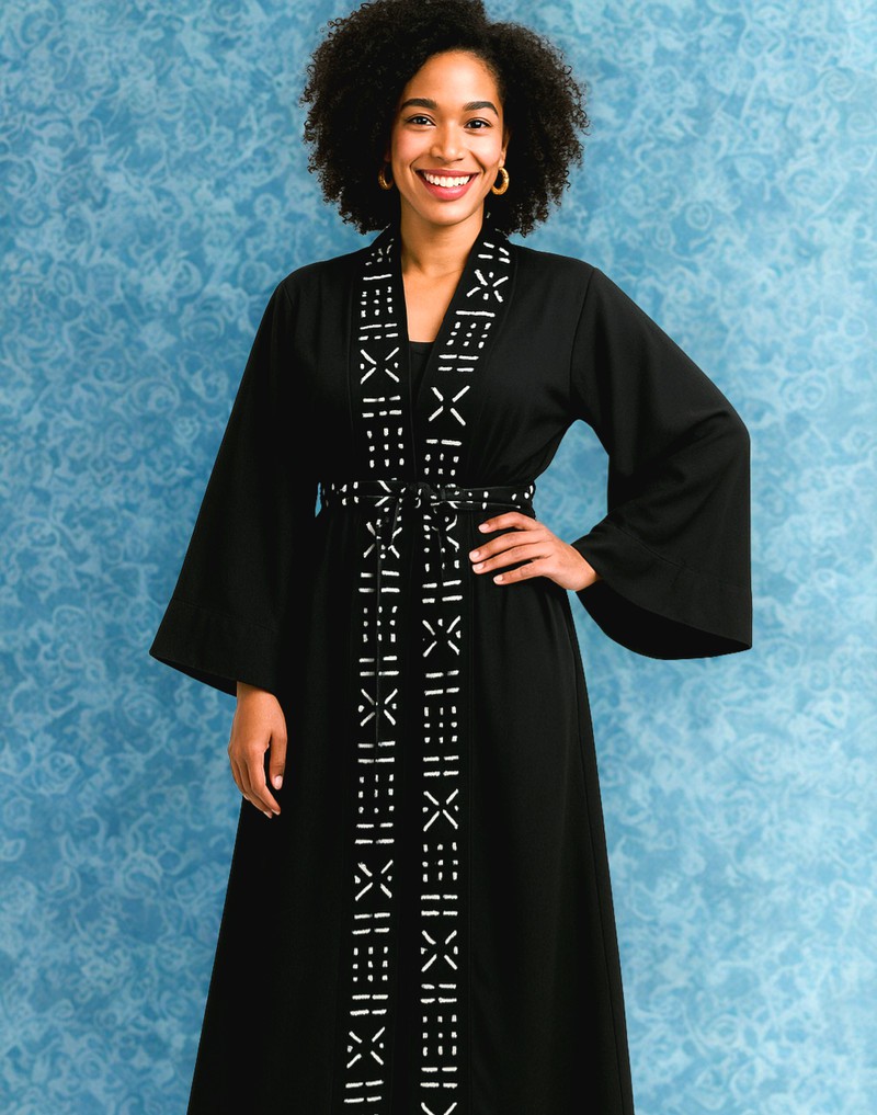 Longueur : Maxi Couleur : Noir avec finitions blanc à motifs Manches : Longues et larges Fermeture : Ceinture à nouer Taille unique convient à différentes morphologies Idéal pour : Soirées, cérémonies, événements professionnels ou tenues casual chic.