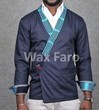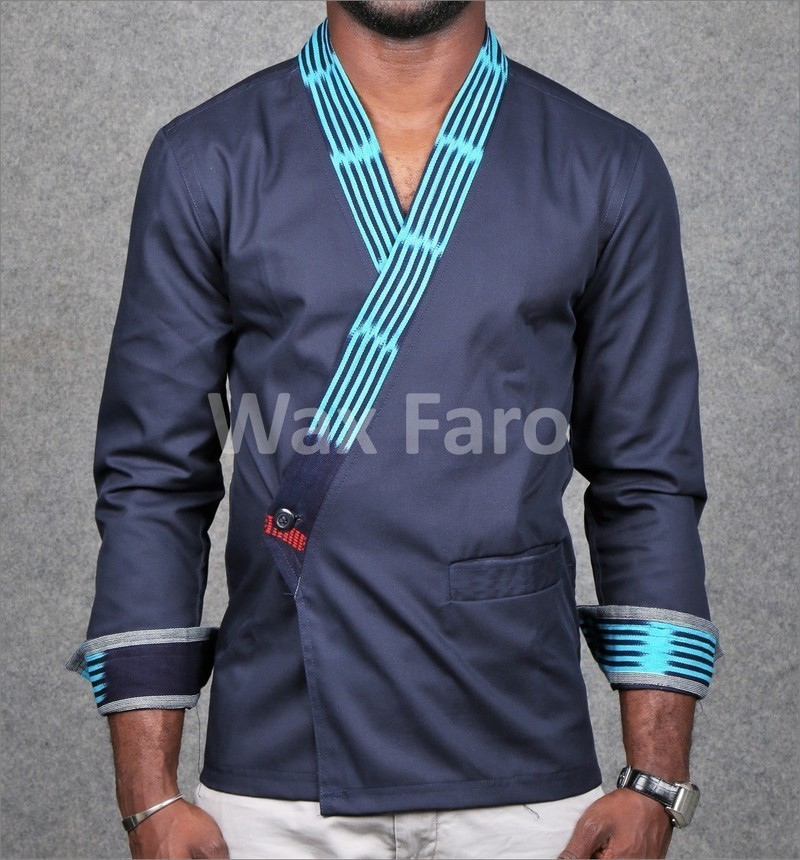 Jolie Veste style kimono en coton avec un col et le revers des manches en pagne Baoulé bleu.