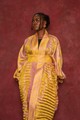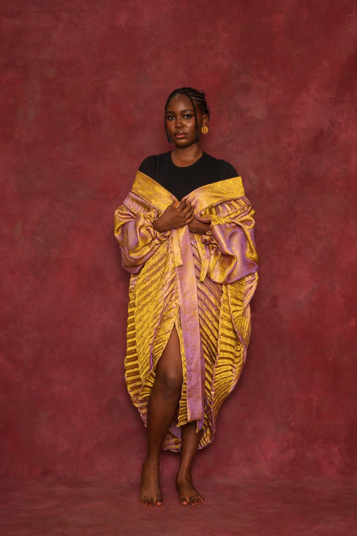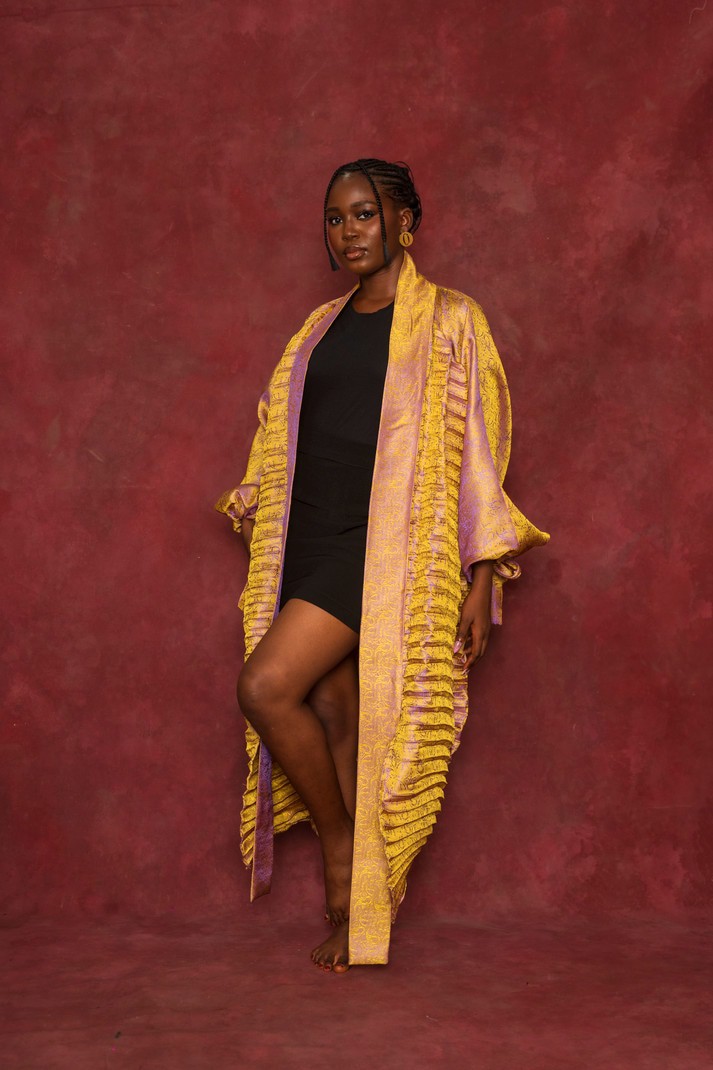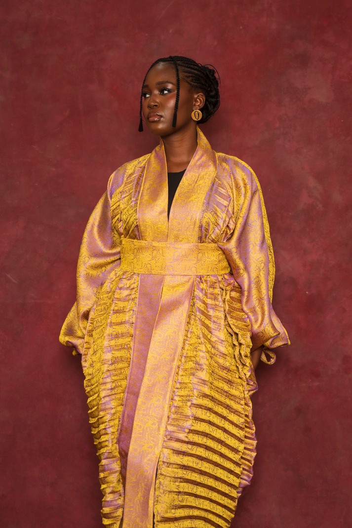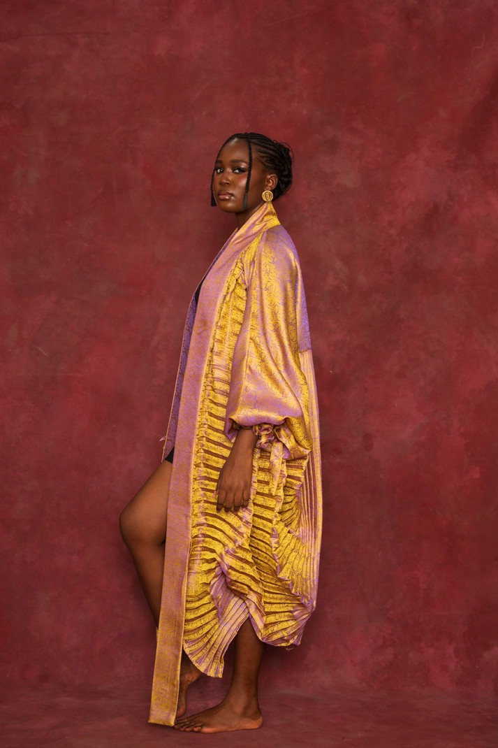 Step into the holiday season in a piece that instantly commands attention. The Kimono Pleated Maxi Jacket 2.0 from TITI BELO is a luxurious, sculptural statement jacket crafted from an iridescent yellow and purple silk damask organza, a luminous fabric that catches light beautifully and shifts between warm gold and soft lilac tones.