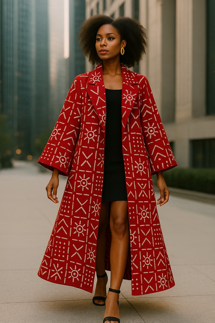 Affirmez votre style avec cette somptueuse veste longue en wax rouge, ornée de motifs géométriques africains blancs. Son design structuré et moderne se marie à la perfection avec l'élégance intemporelle du tissu traditionnel. La coupe longue et fluide offre une silhouette majestueuse, idéale pour magnifier une robe simple ou rehausser un look de soirée.