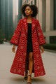 Veste Longue Élégante en Wax Rouge Affirmez votre style avec cette somptueuse veste longue en wax rouge, ornée de motifs géométriques africains blancs. Son design structuré et moderne se marie à la perfection avec l'élégance intemporelle du tissu traditionnel. La coupe longue et fluide offre une silhouette majestueuse, idéale pour magnifier une robe simple ou rehausser un look de soirée. Tissu : Wax de qualité supérieure, doux et résistant Couleur : Rouge vif avec motifs géométriques blancs