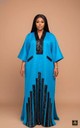 This spectacular maxi-dress is a fusion of comfort and high-impact glamour, offering a modern take on the traditional kaftan silhouette that is perfect for statement-making events. The dress features a dramatically oversized and flowing column silhouette with generous kaftan-style sleeves, ensuring maximum comfort and an elegant, effortless drape, and is crafted from a smooth crepe fabric in an electrifying electric blue hue. The garment is instantly elevated by the rich black sequin embellishment detailing a striking geometric V-neckline and forming bold, linear, bursting firework-like patterns that extend vertically across the skirt, along with subtle black pocket accents, injecting dynamic sparkle and graphic contrast. This luxurious and comfortable ensemble is an ideal choice for occasions such as gala dinners and upscale receptions, destination or resort events, holiday parties, and any sophisticated gathering where a memorable, culturally-inspired, and commanding presence is desired.