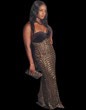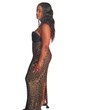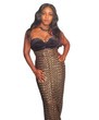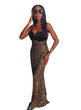 This piece is designed as a bustier corset-style fitted long dress featuring a slit at the back. Dress is lined up to knee length as fabric is slightly transparent.