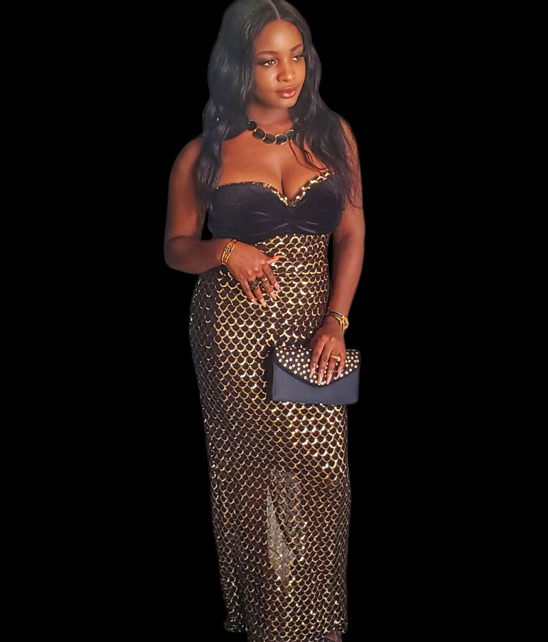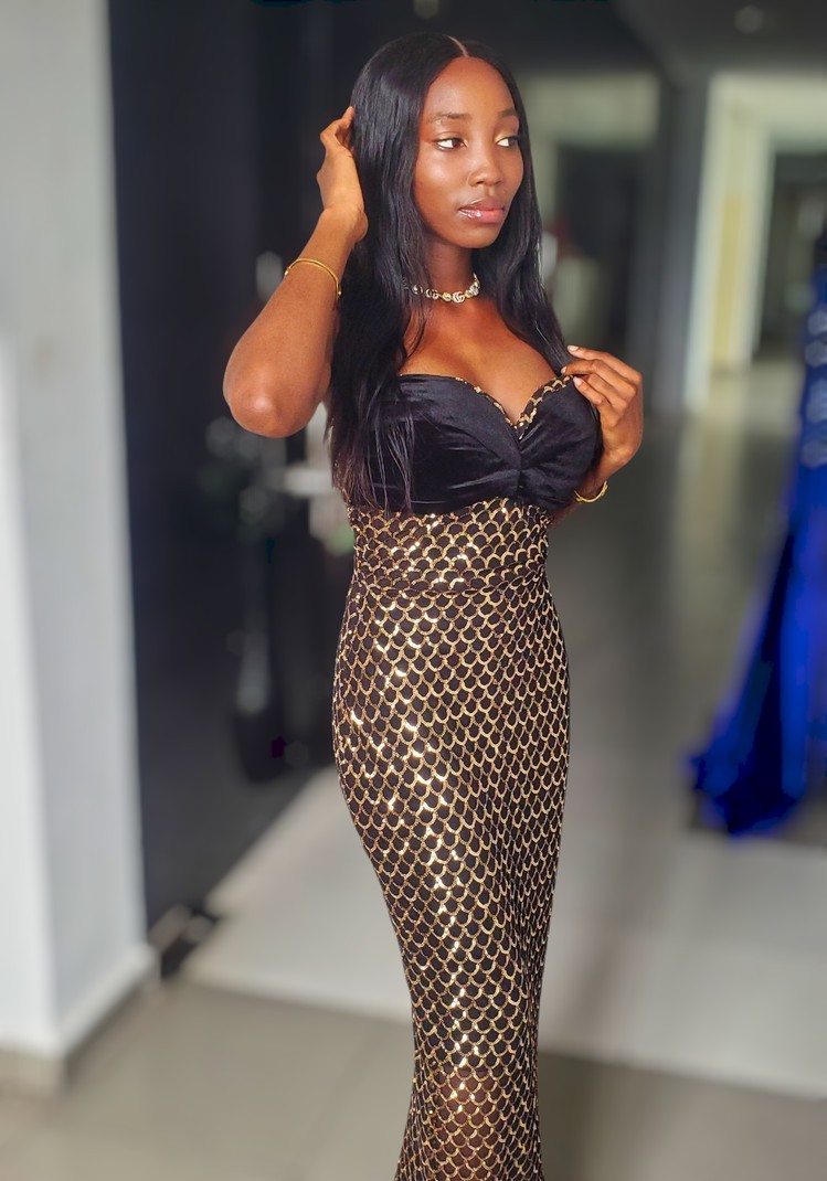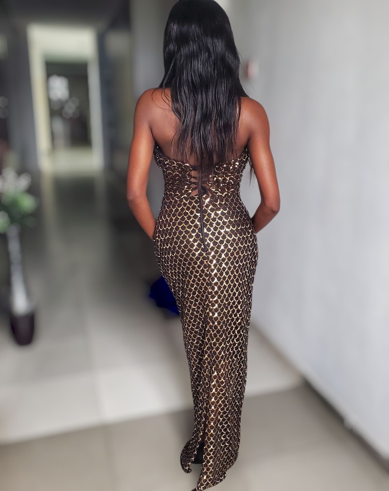 Delicately handmade from a rare luxury stretch sequin fabric, this piece is combined with premium quality velvet fabric at the bust area.