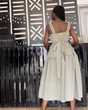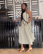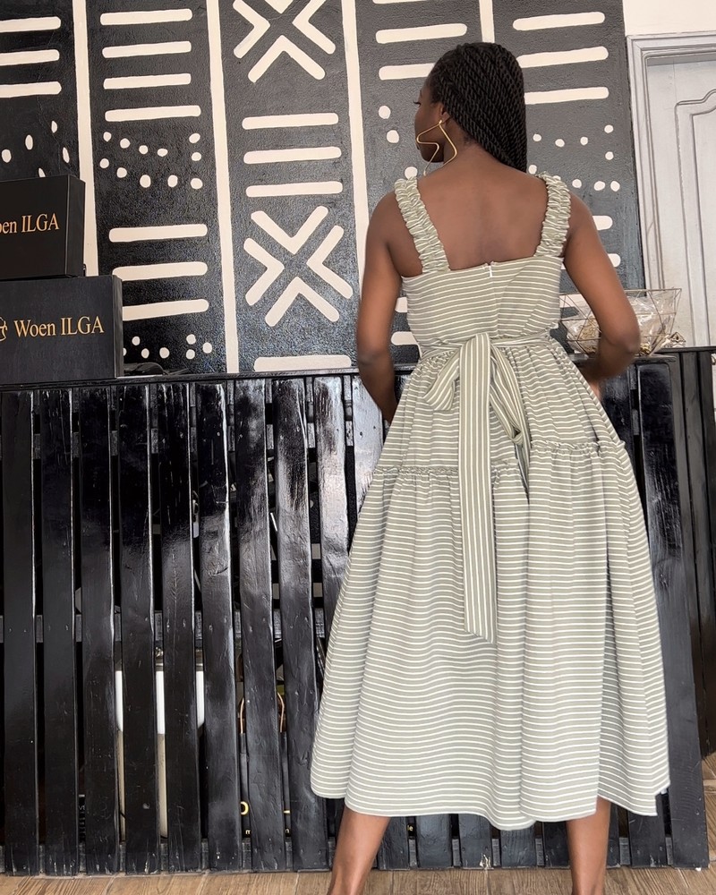 The Lekki dress is a women's dress, midi, sleeveless, oval. It has the particularity of pleated strings as sleeves. It is made of crepe fabric. This dress is just as comfortable as descent and it can be worn on the occasion of a wedding, dinner, lunch, cocktail, birthday or brunch. The dress is easy to maintain as it can be machine or hand washed. It is available for delivery anywhere in the world. The model in the photo is wearing size M. Please consult our size guide to make sure you choose the right size.