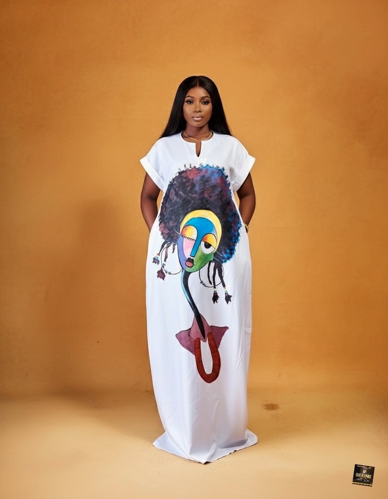 This Abstract Art Maxi-Dress is an absolutely captivating wearable masterpiece, designed for the fashion-forward individual who views clothing as a canvas for expression. Crafted from a comfortable, Crepe fabric, the dress offers a structured yet relaxed drape that beautifully showcases the artwork. The pristine white canvas highlights the striking, large-scale abstract portrait print centered on the front, featuring a stylized face rendered in bold, expressive colors like yellow, blue, green, and deep purple, surrounded by a voluminous, textured Afro silhouette. The dress features a classic, comfortable maxi silhouette with short, structured sleeves, a simple high neckline, and practical side pockets. This unique garment is perfectly suited for art gallery visits, summer festivals, casual-chic daytime events, museum outings, or any setting where you want to make an intentional, sophisticated artistic statement, promising to spark conversation and admiration wherever you go.