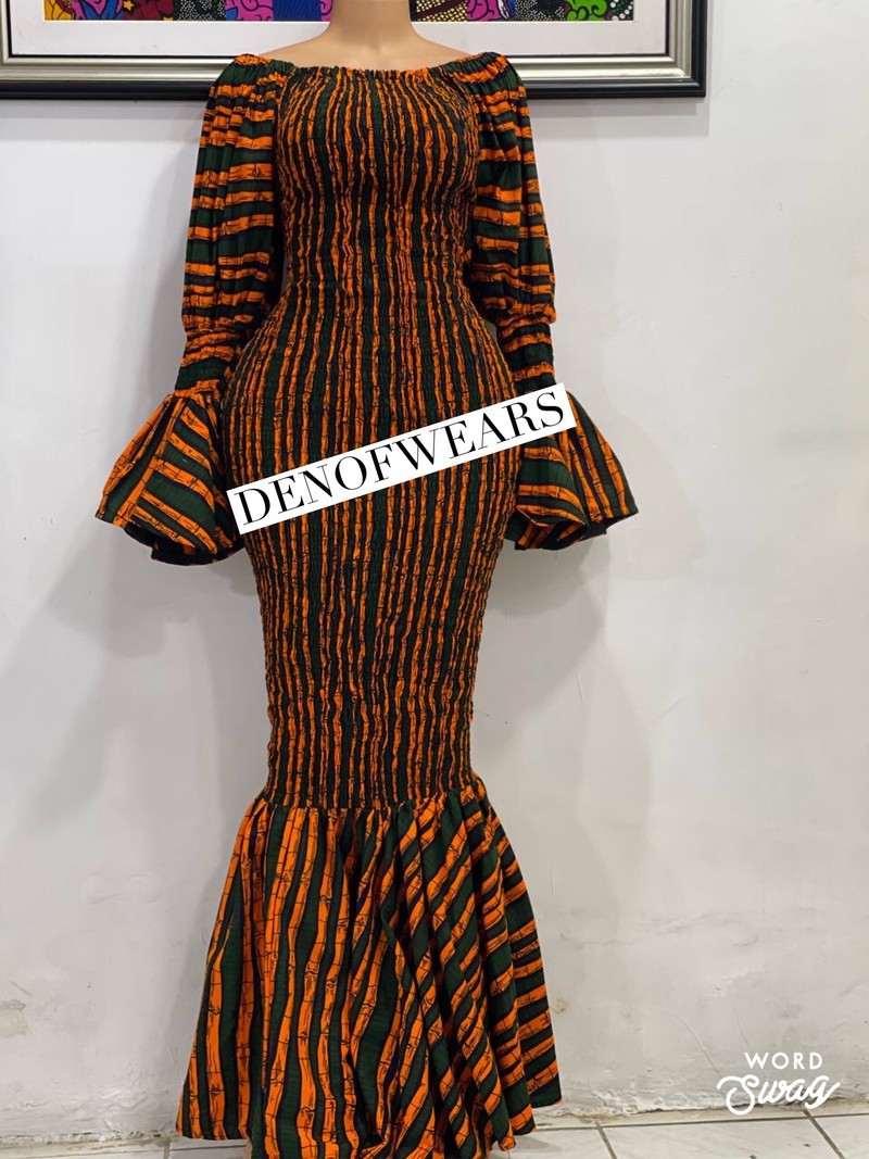 Long Ankara smocked dress. Bodycon African print dress.Ankara dress long sleeves
