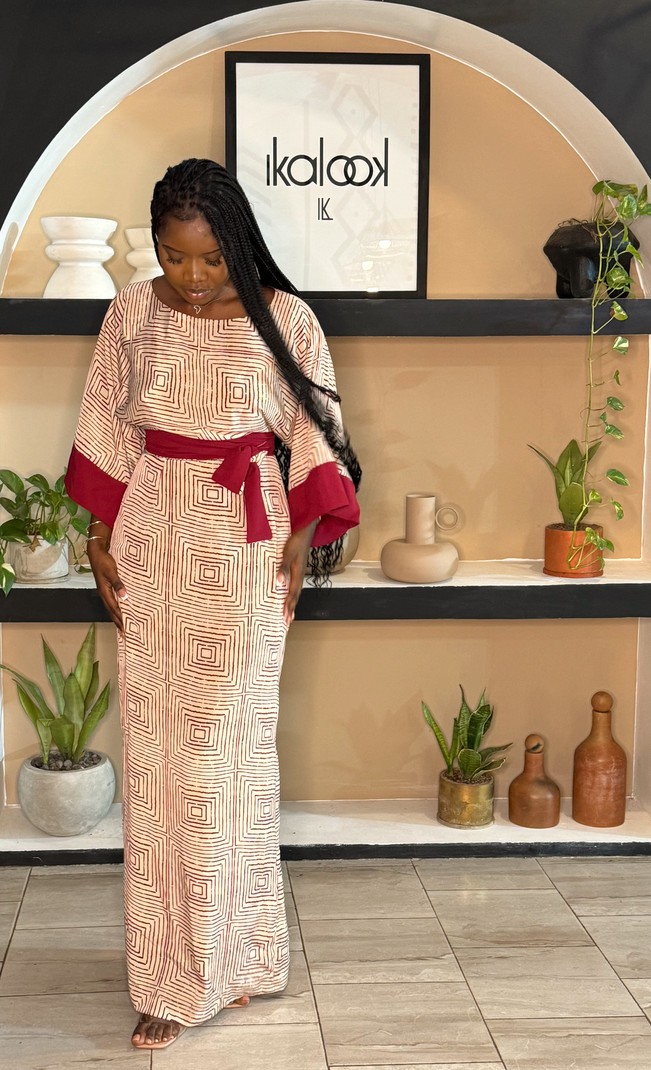 C’est la robe Didi en crêpe imprimé bogolan bordo beige