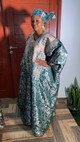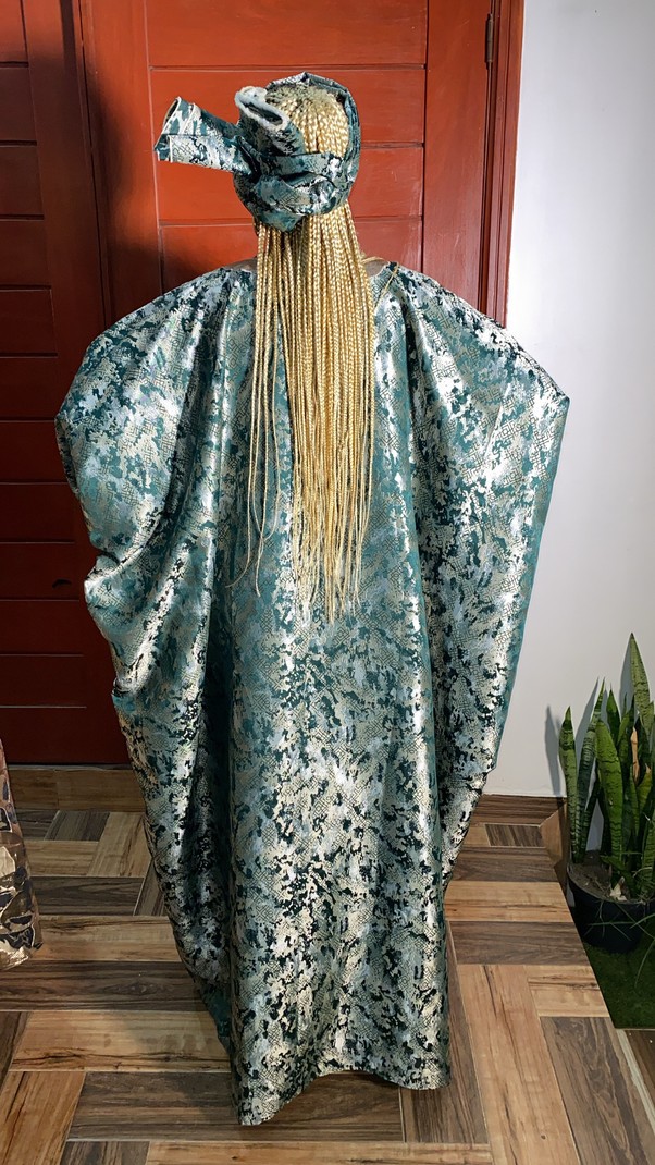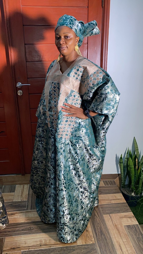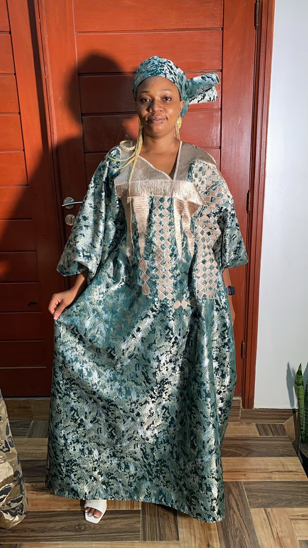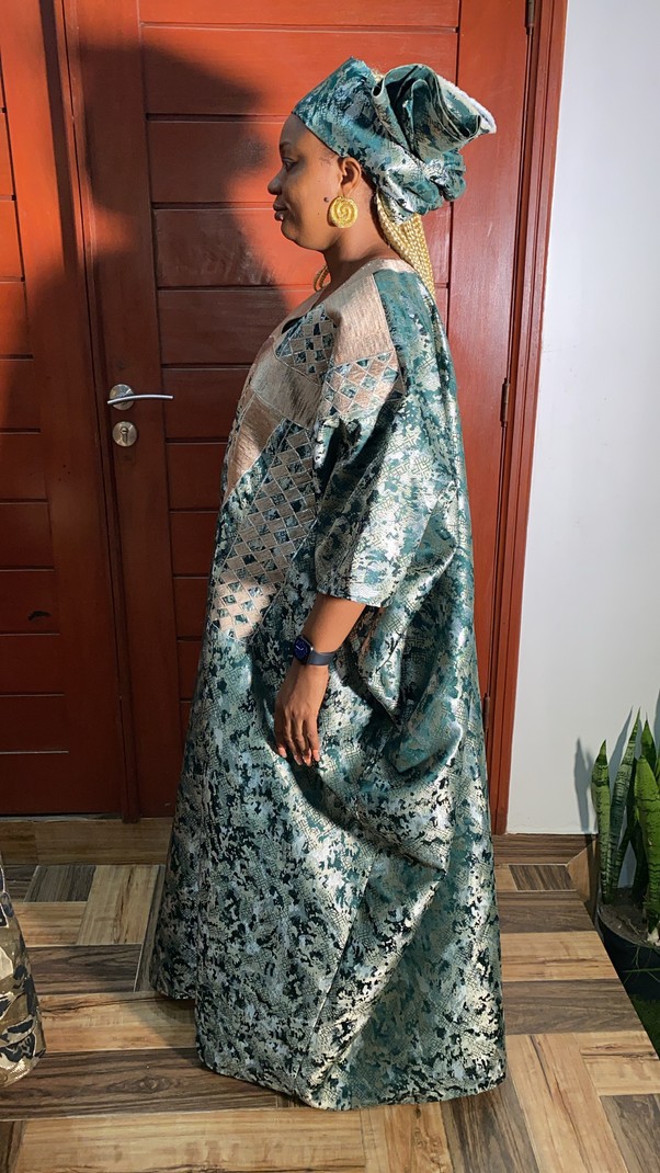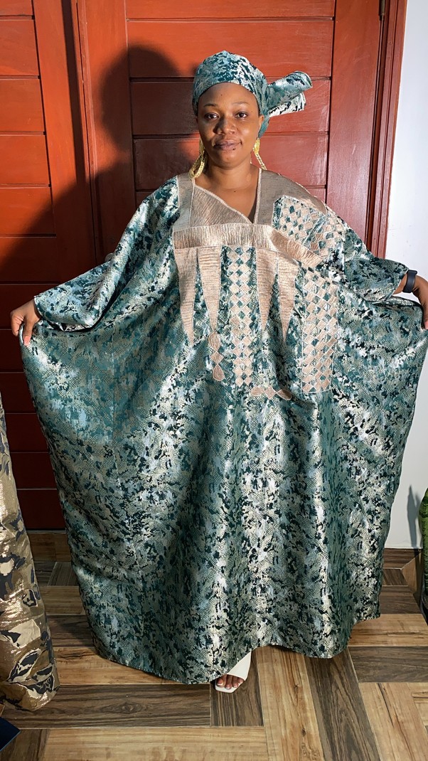 Très Beau boubou en tissu Damask Fleury Reflective brodé avec une corde interne et un Foulard pour femme adapté à toutes les tailles et les occasions. Si vous souhaitez vous démarquer pendant les cérémonies et les sorties c’est fait pour vous.