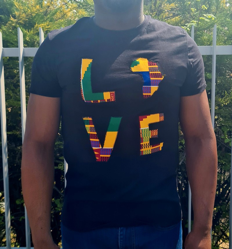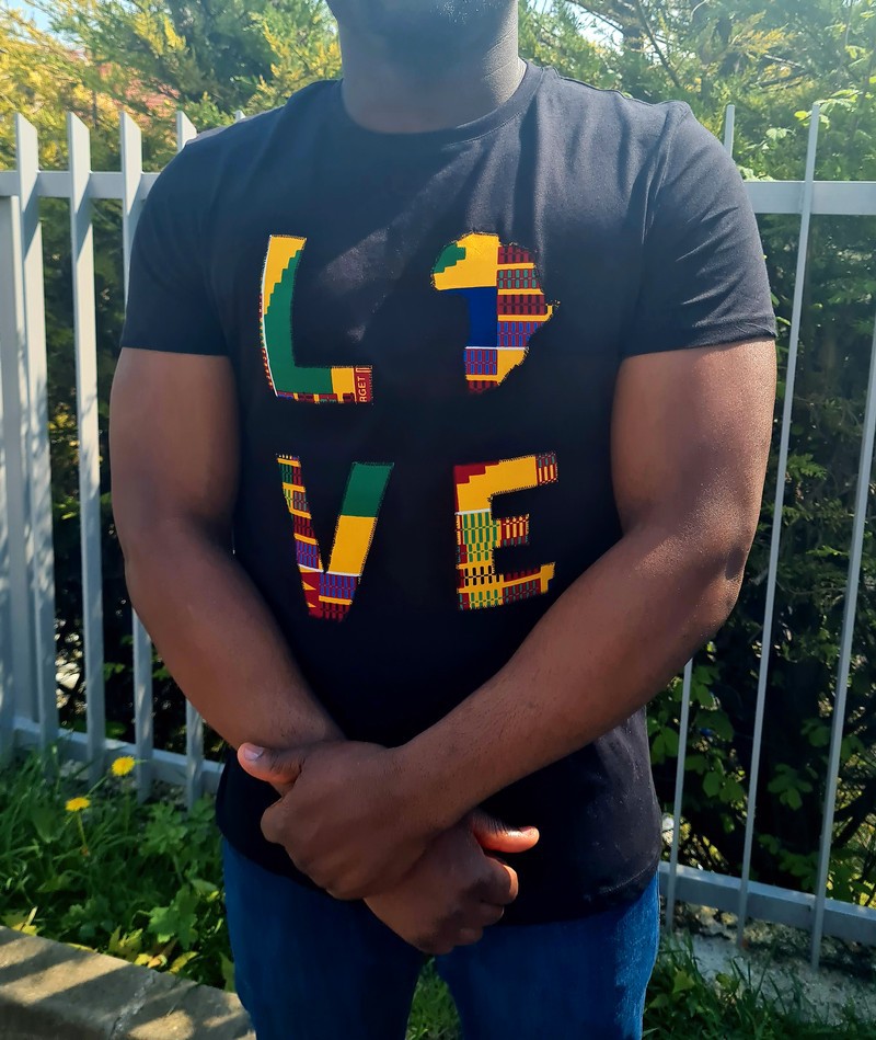 Black t-shirt printed "LOVE Africa map" Patch kente / kita patterns Can be made to order with the wax fabric of your choice