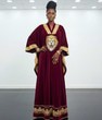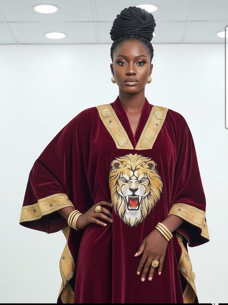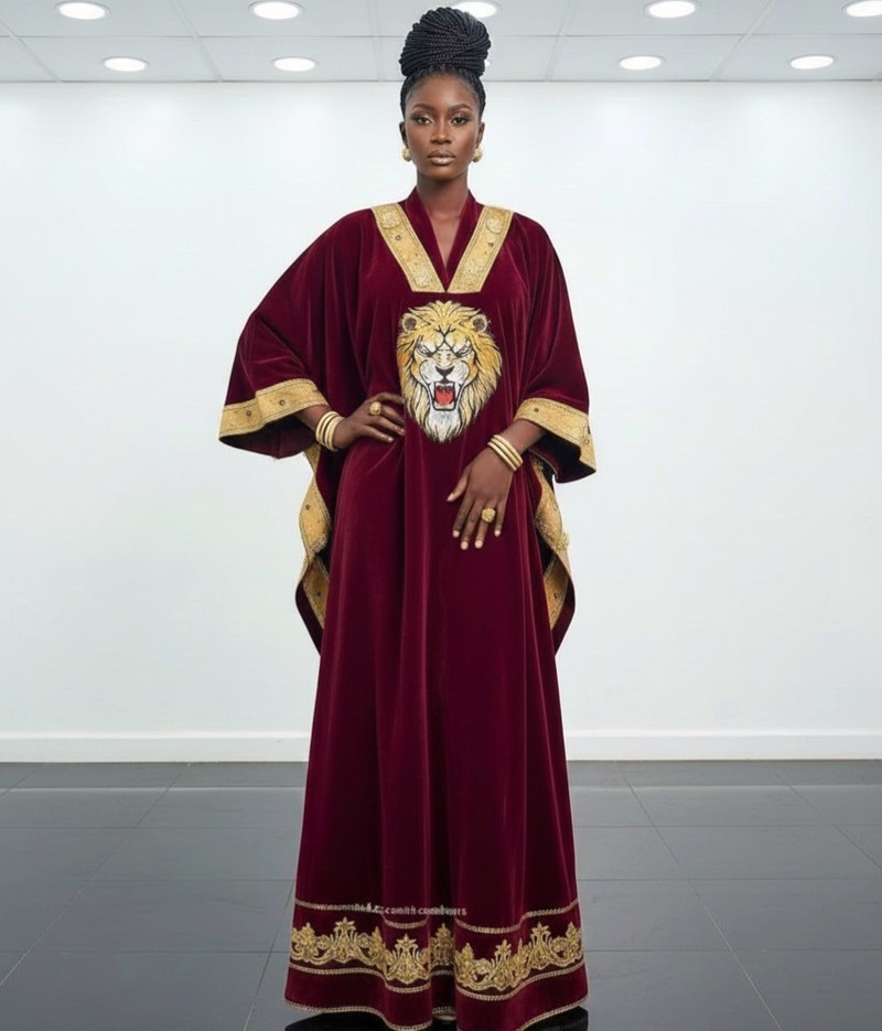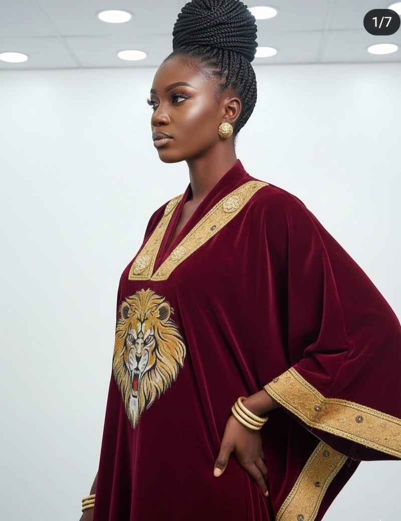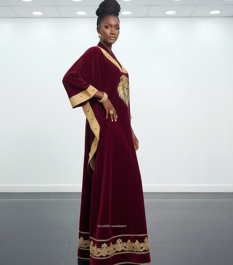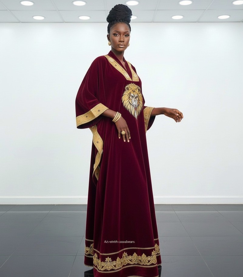 This premium luxury kaftan by Az-rebirth-casualwears is masterfully crafted from rich maroon royal velvet. The centerpiece features a bold gold lion head embroidery that symbolizes strength and African royalty. Detailed gold metallic patterns adorn the V-neckline and the wide flowing sleeves for a regal finish. A heavy embroidered border runs along the hem, creating a grand silhouette that looks stunning from every angle. The deep burgundy fabric is designed to glow under bright lights and looks exceptionally beautiful on dark skin tones. This studio-standard gown offers a comfortable, free-flowing fit perfect for high-end weddings and special celebrations. It is a true statement piece that brings together traditional heritage and modern luxury fashion.