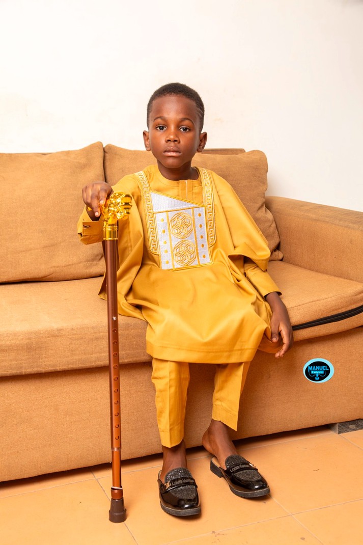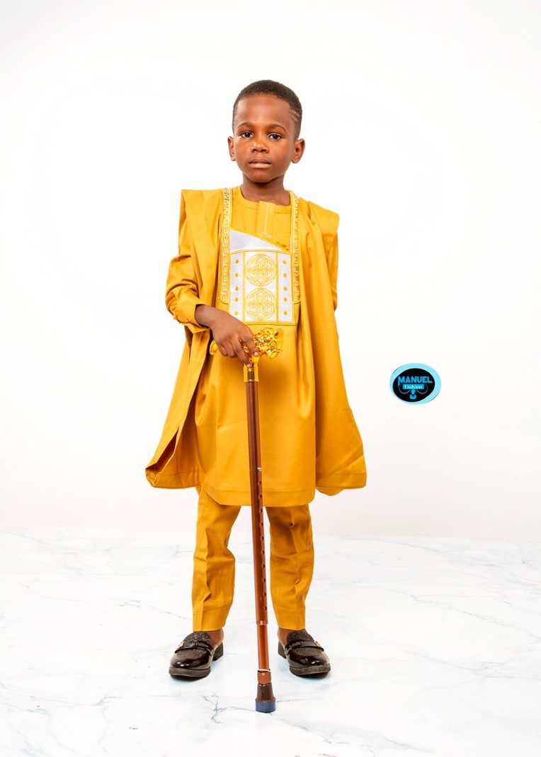 Let your child shine with the Manuel Fashion Golden Majesty Agbada Set! This elegant ensemble features a rich golden Agbada with intricate white embroidery down the front, paired with matching slim-fit trousers. The set includes a flowing outer layer that adds a regal touch, perfect for African Traditional Weddings, festivals, or cultural celebrations. Crafted for comfort and style, this outfit ensures your little one looks royal while staying comfortable throughout the day.