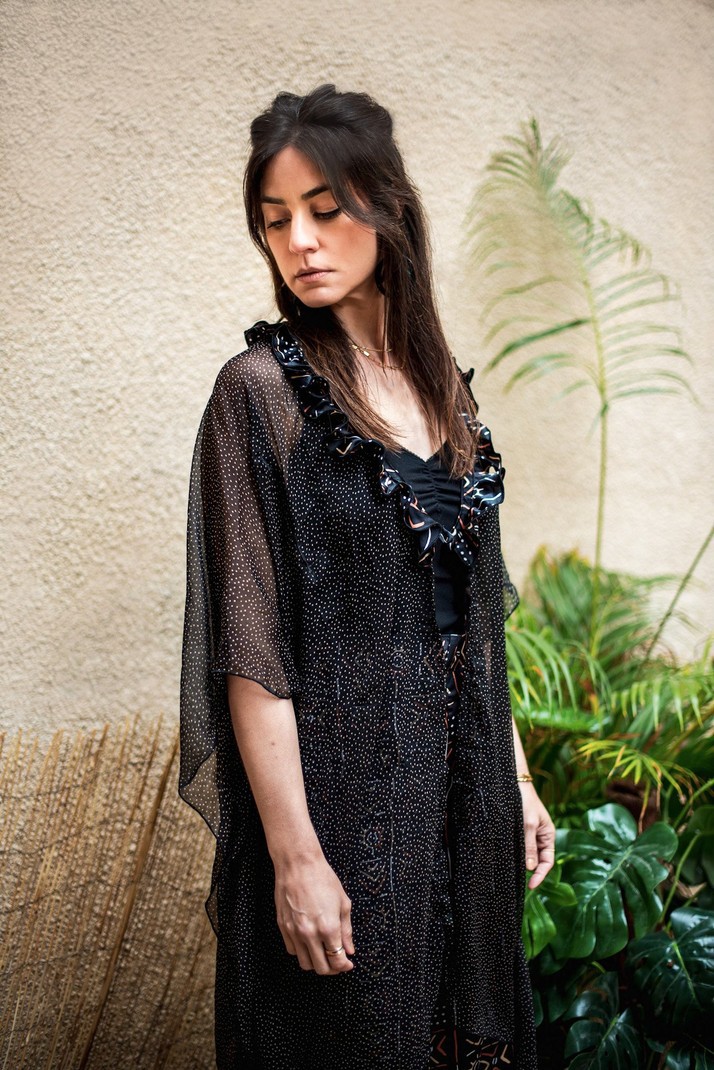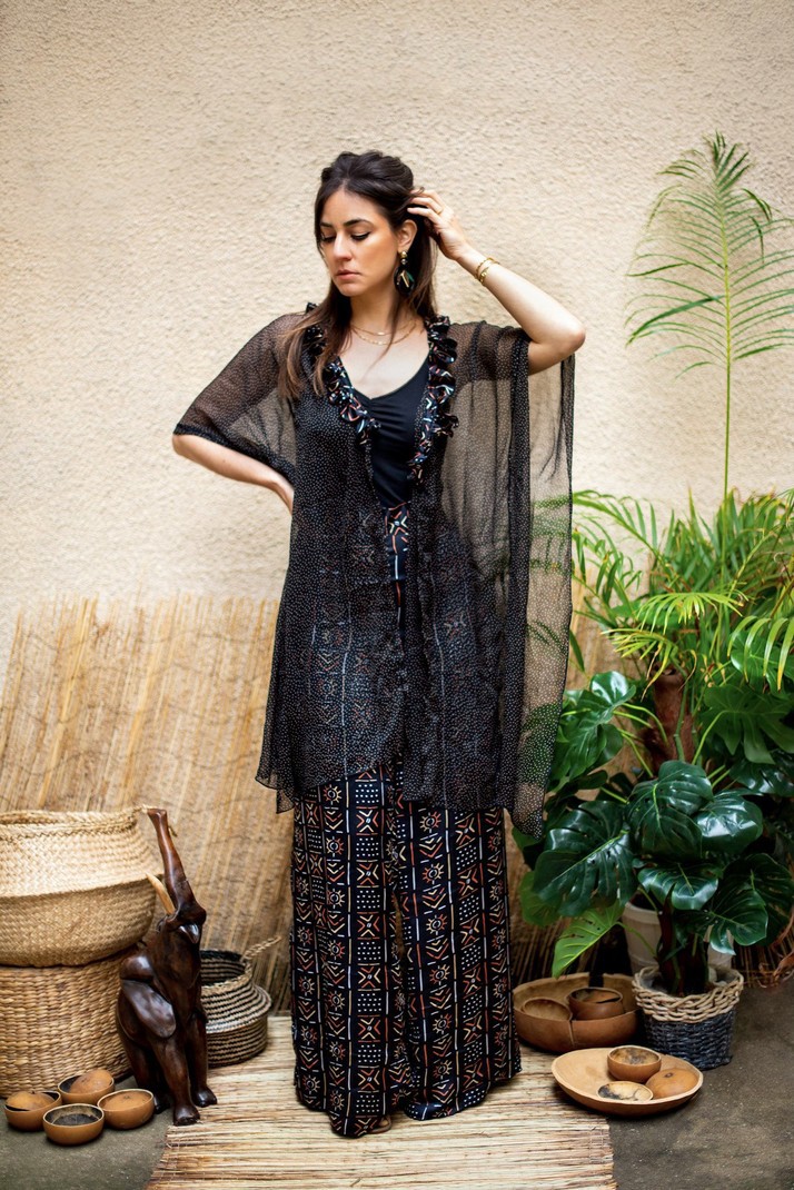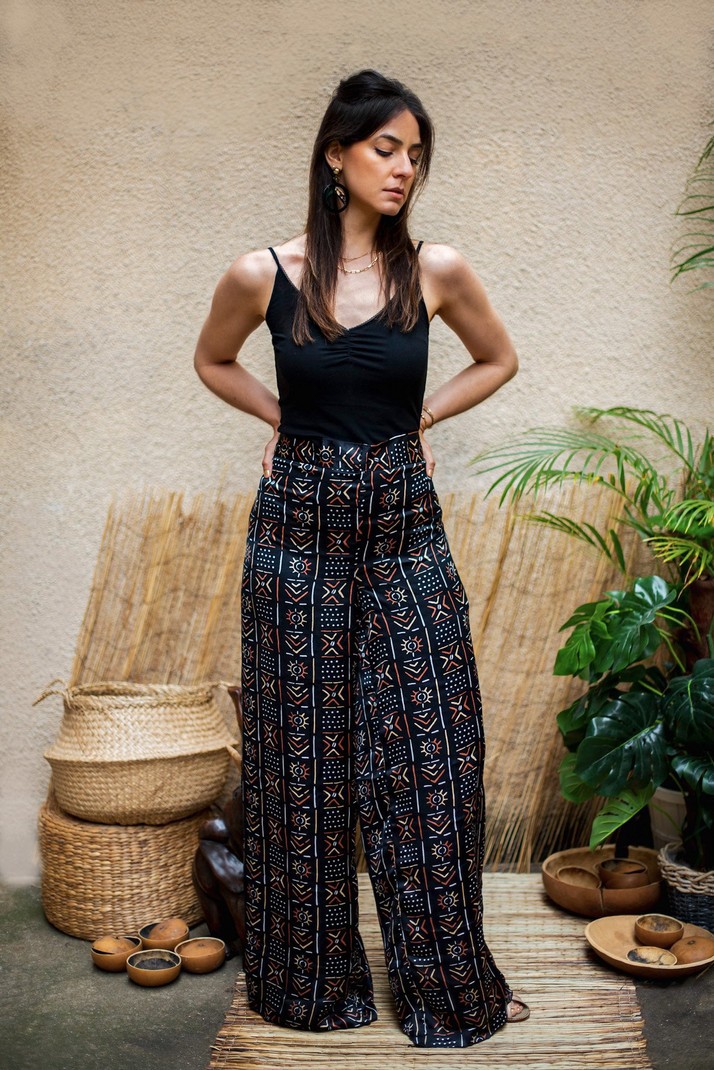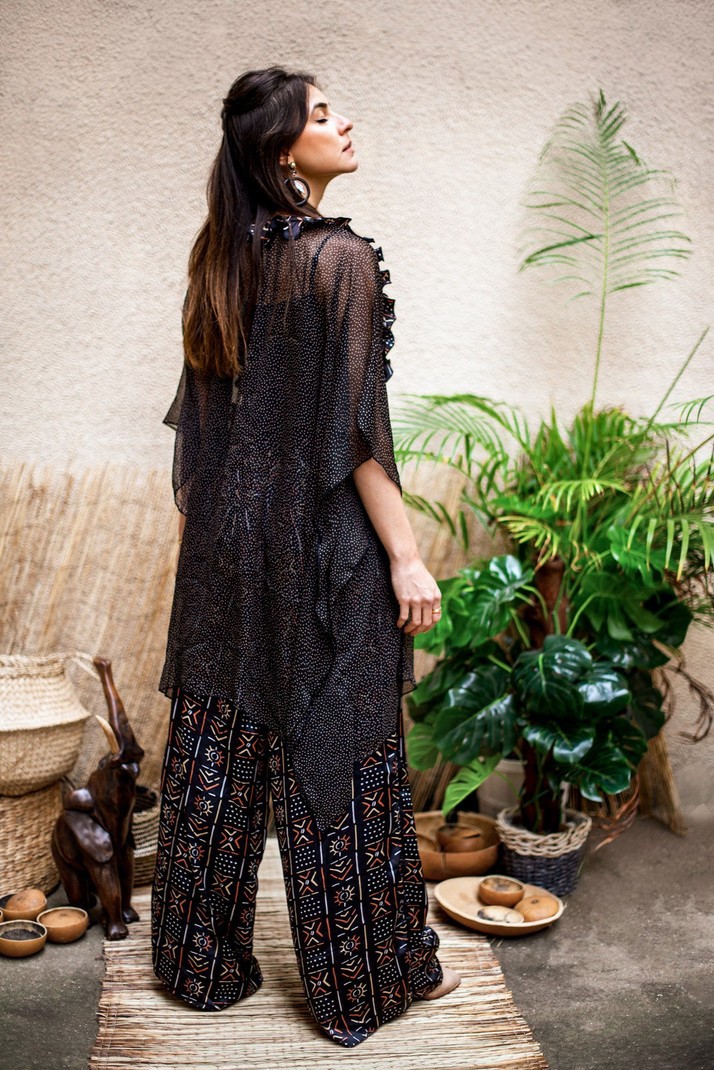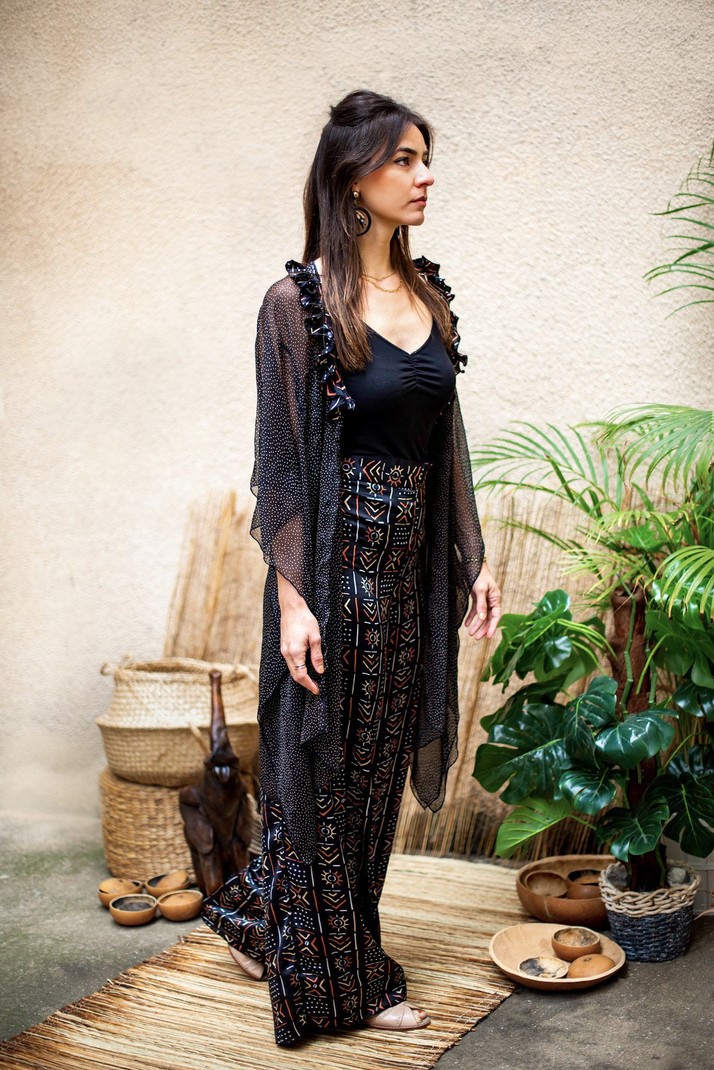 Signed by the Maison Laure Art, two-piece set with black, white, red and beige tunic and wide pants, accompanied by its protective mask. A silk fabric for the pants and the mask and for the tunic in transparent veil. The pants have an elastic at the back as well as side pockets. The tunic is in transparent veil with ruffles at the collar and can be worn open or closed with a button. Tunic: 91 cm long Pants: 119 cm long Silk and transparent veil 7 colors available OUR MANUFACTURING: Our Franco-Beninese handmade ensemble collection is an artisanal, authentic and traditional manufacture, entirely handmade in workshops integration, by passionate women.