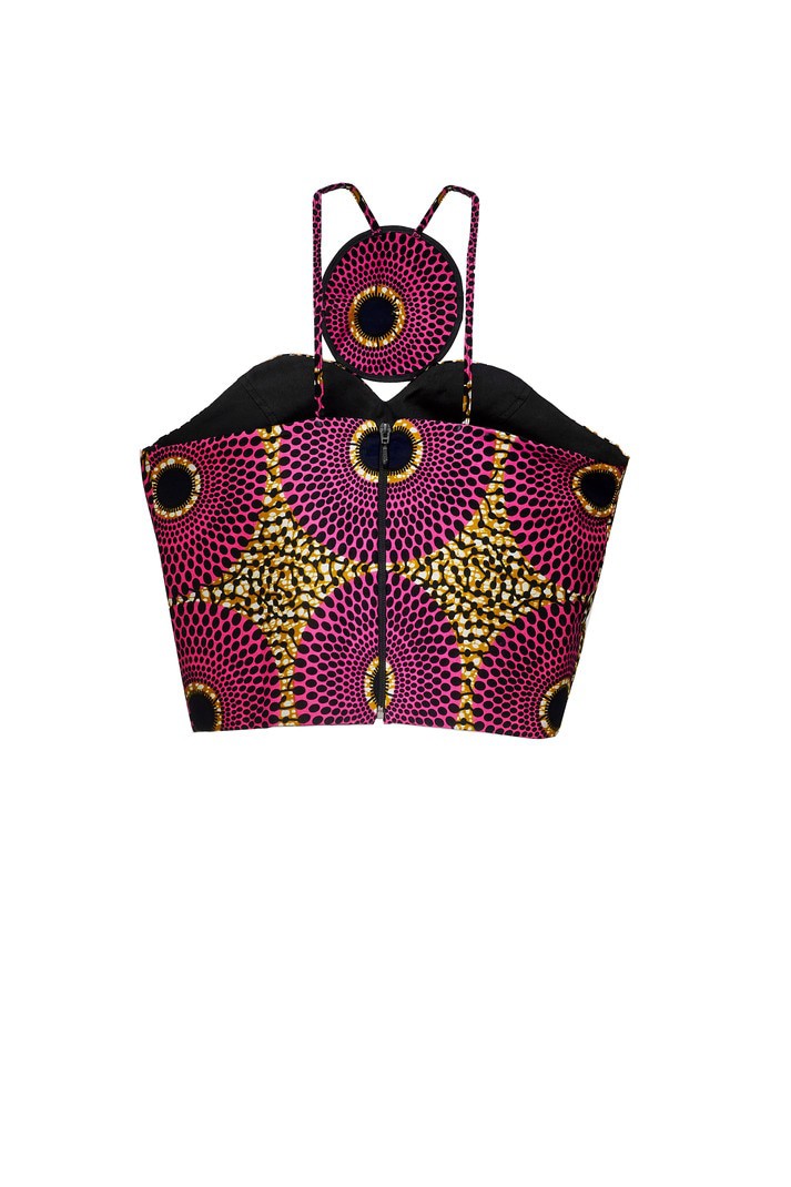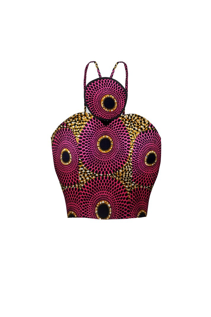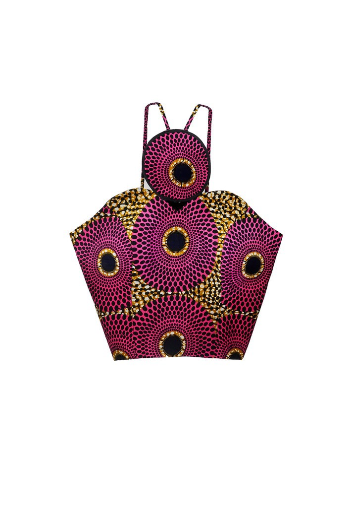 Crafted from Ankara, this halter-neck silhouette is designed to flatter, with a striking play on the circular motif that evokes the beauty.
