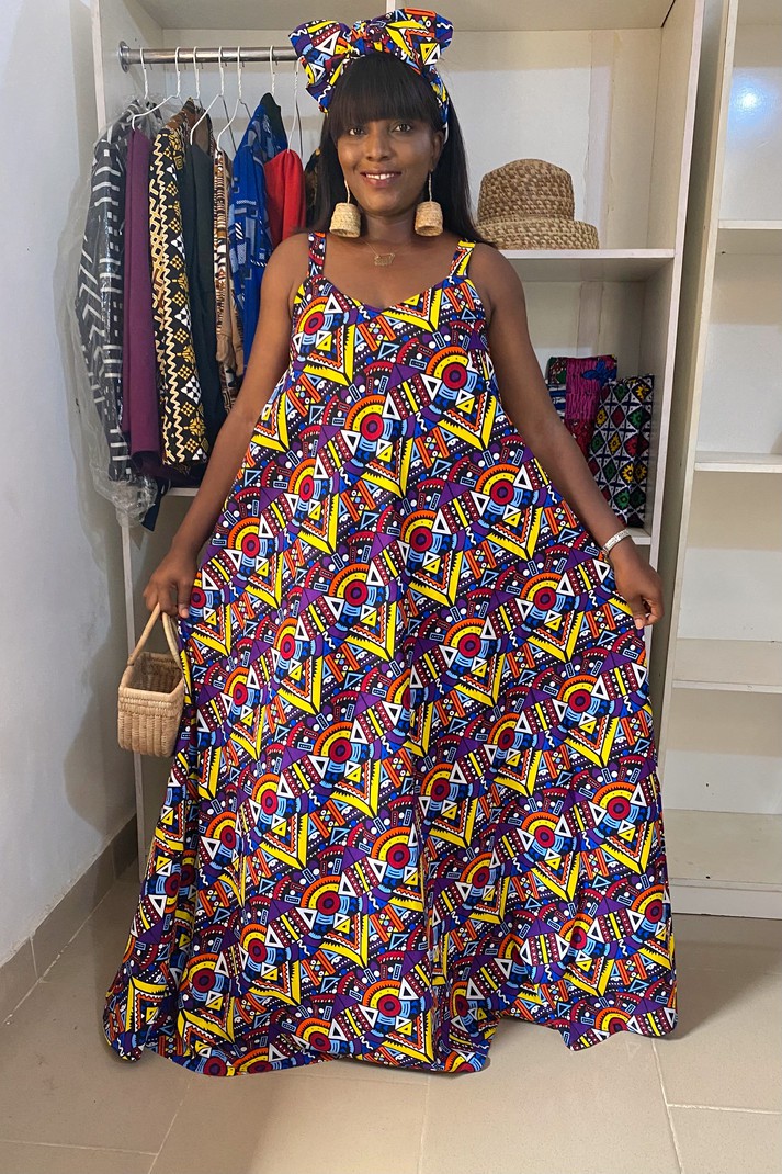 Beautiful maxi dress made from the best quality Ankara fabric. Also comes with a matching scarf.