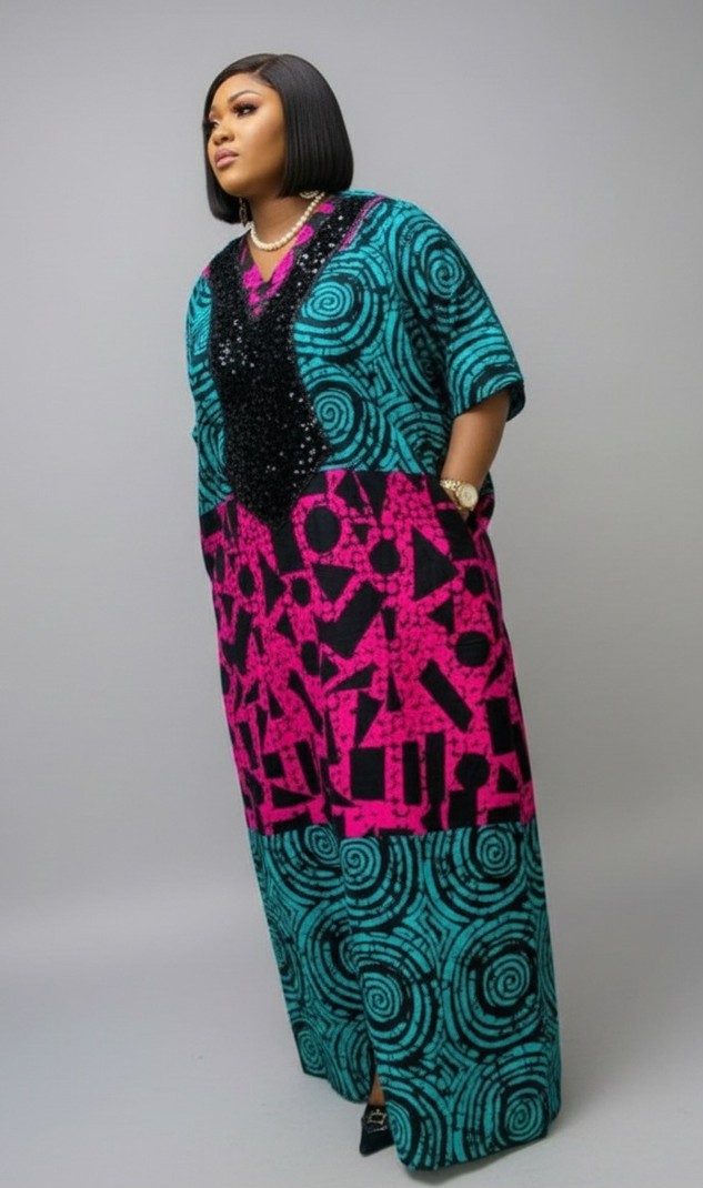 Chic Teal and Pink Ankara Dress with Sequin Detailing