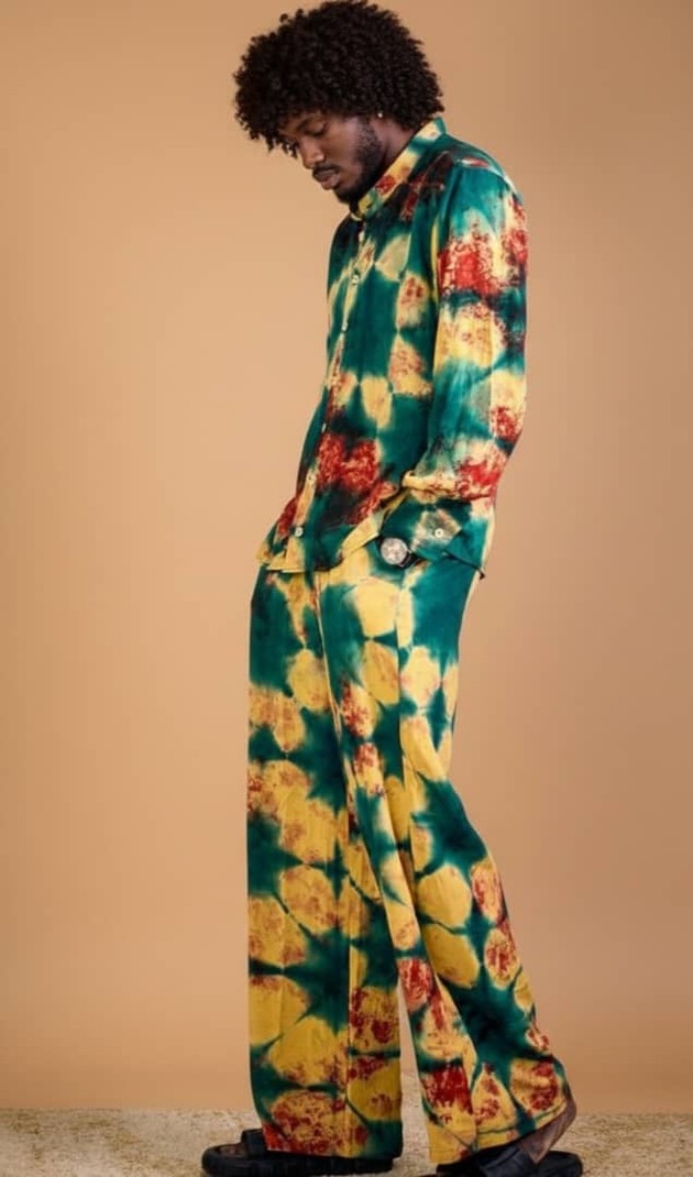 This vibrant two-piece set for men is expertly crafted from premium, high-lustre silk that offers a lightweight, breathable feel and a sophisticated natural drape. The ensemble features a relaxed-fit, long-sleeved button-down shirt with a classic collar and coordinating wide-leg trousers, all unified by a bold, multi-colored hand-dyed adire pattern in rich shades of forest green, golden yellow, and deep crimson. This versatile outfit is an ideal choice for high-end cultural celebrations, artistic evening receptions, or upscale tropical vacations where you want to project a look of modern, effortless elegance rooted in traditional craftsmanship.