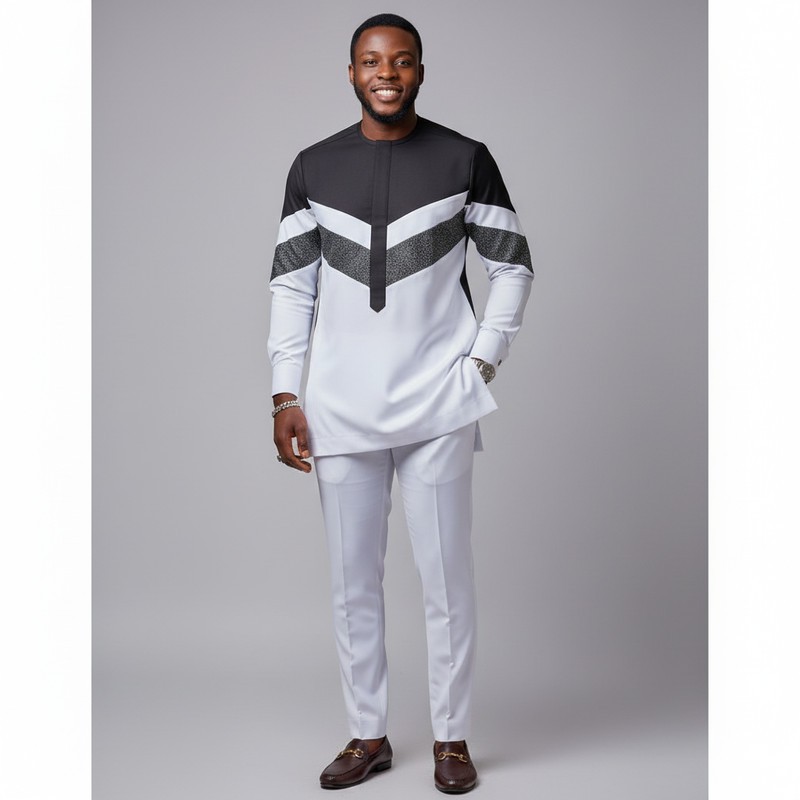 Step out in bold elegance with this striking modern Nigerian two-piece set. Featuring a crisp white tunic and trousers accented by a geometric black and sparkle chevron design across the chest and shoulders. Perfect for weddings, formal events, and cultural celebrations, this outfit blends traditional style with a contemporary, sharp silhouette.