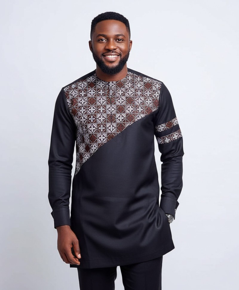 Men’s Black Senator Wear with Ankara Chest Panel – Stylish Long Sleeve African Top