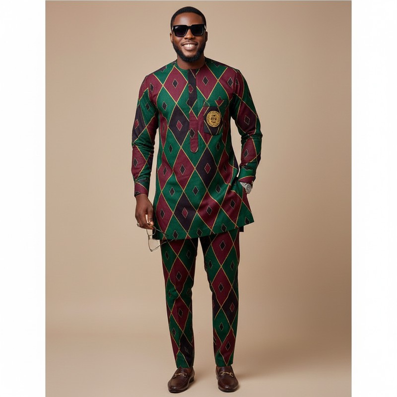 Make a memorable statement with this vibrant Full Ankara Suit Set, featuring a striking, coordinated diamond (argyle) print. The rich combination of deep forest green and wine/burgundy creates an incredibly sophisticated yet festive look on both the long-sleeve tunic top and the tailored trousers. This is the ultimate outfit for those who want to celebrate culture with a tailored, modern flair.