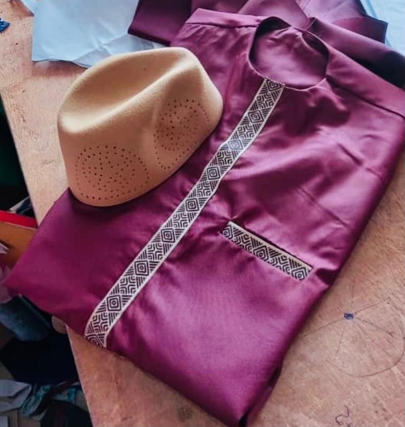 Ensemble pour homme style caftan africain. Il est composé d un haut, d un pantalon qui peut être noué au niveau de la taille et de son chapeau assortie.