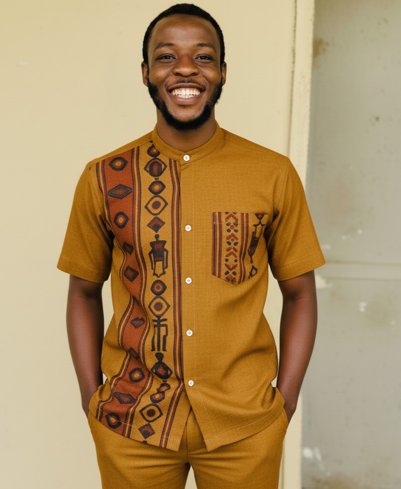 Elevate your style with this striking men's two-piece set. Features a light beige linen-texture short-sleeve shirt with a band collar, vibrant Kente cloth strip, and a bold black Africa silhouette emblem on the pocket. Includes matching trousers for a complete, culturally inspired look. Shop modern African attire.