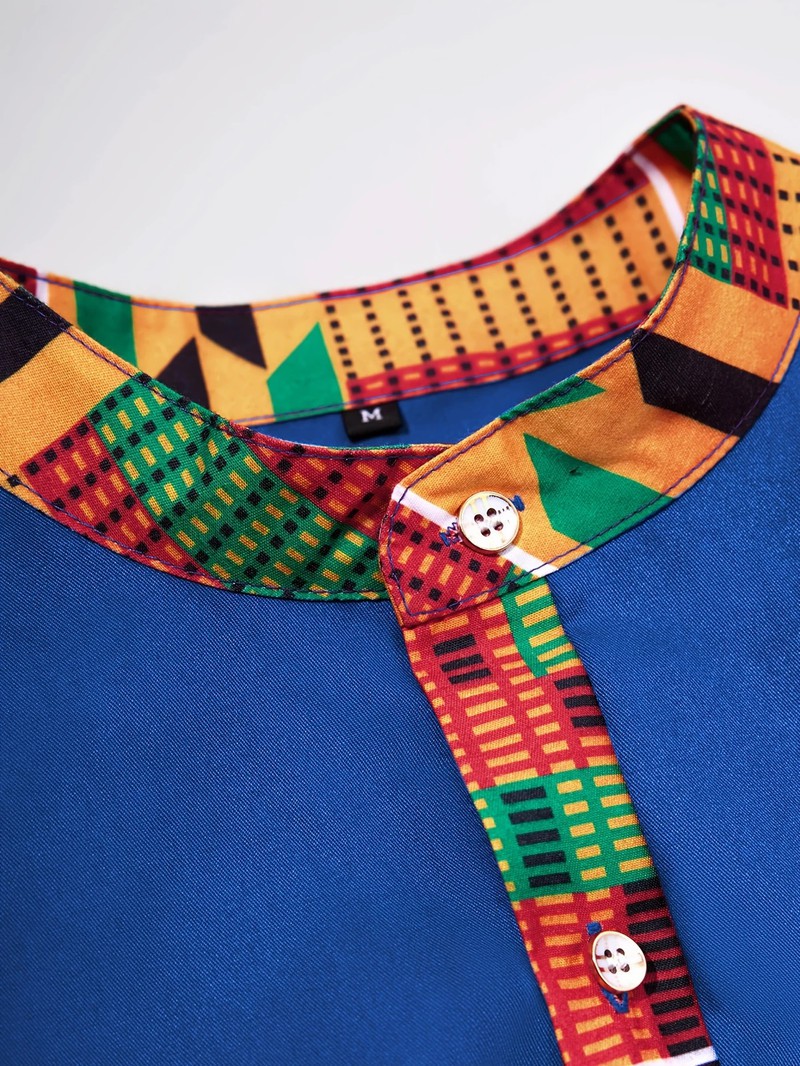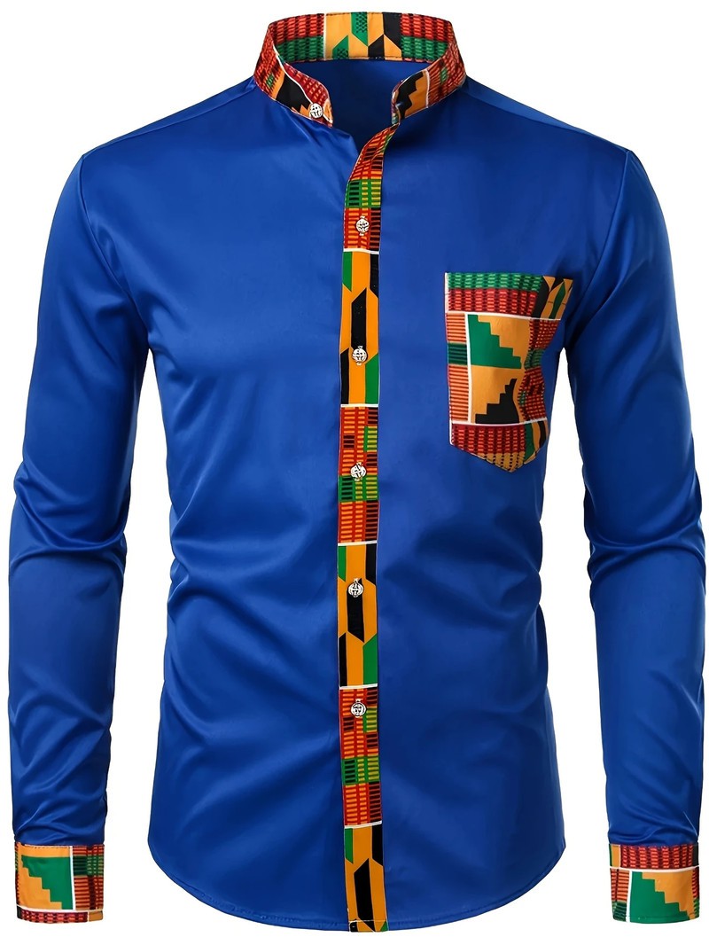 Men'S Long Sleeve Dress Shirt, Ethnic Print, Stand Collar, Regular Fit, Polyester, All Seasons, Mature Style, Woven Fabric, Button Detail
