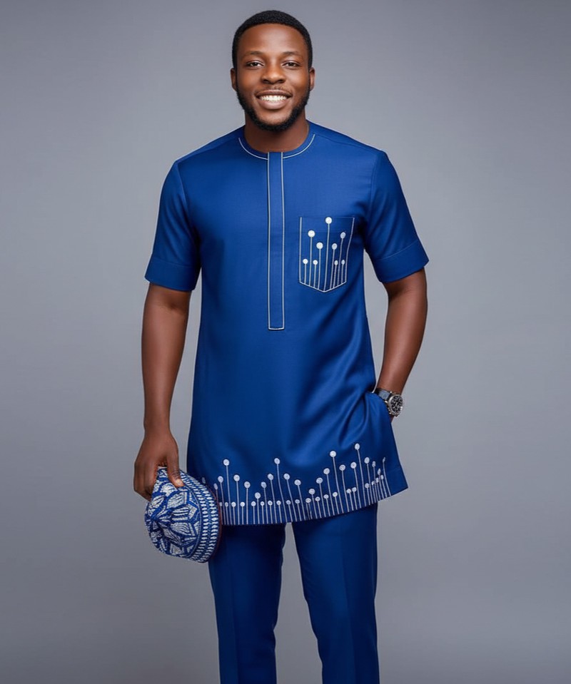 Step out in classic elegance with this beautifully crafted royal blue senator outfit. Designed with a modern embroidered pattern on the hem and pocket, this short-sleeve top paired with matching trousers delivers a clean, stylish, and sophisticated look. Perfect for any event where you want to stand out with confidence and class.