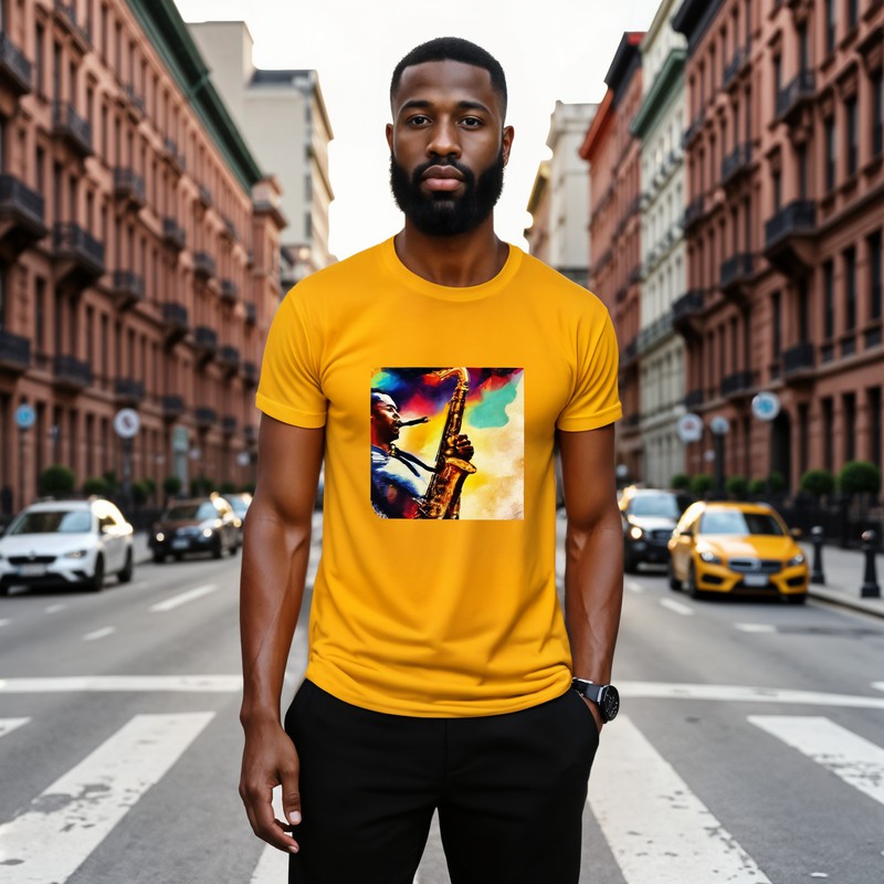 Inspired by originator of Afrobeat, Fela Kuti. The vibrant print features an inspired performance of Fela with his saxophone, surrounded by colorful water colour art.