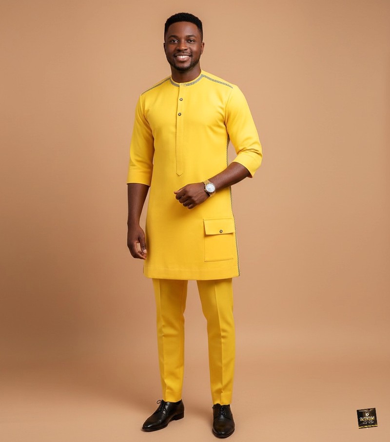 This vibrant, eye-catching yellow ensemble offers a contemporary and energetic take on traditional menswear. The set features a sleekly tailored tunic with a distinguished band collar and comfortable three-quarter sleeves. The bright, monochromatic design is refined by subtle contrast stitching in a dark tone that outlines the collar and runs down the side splits, adding a refined, structural detail. Practicality is integrated with a square flap pocket positioned on the wearer's right hip. The tunic is perfectly paired with matching slim-fit yellow trousers, creating a bold and cohesive look. Finished with black dress shoes, this outfit is guaranteed to make a confident and stylish statement at celebratory events, parties, or any occasion requiring a standout look that merges traditional form with modern color and detail.