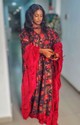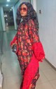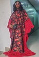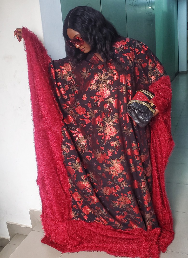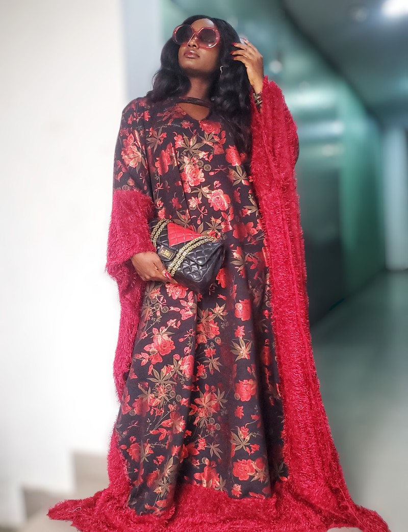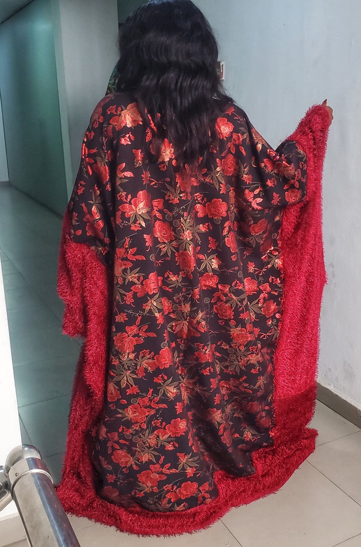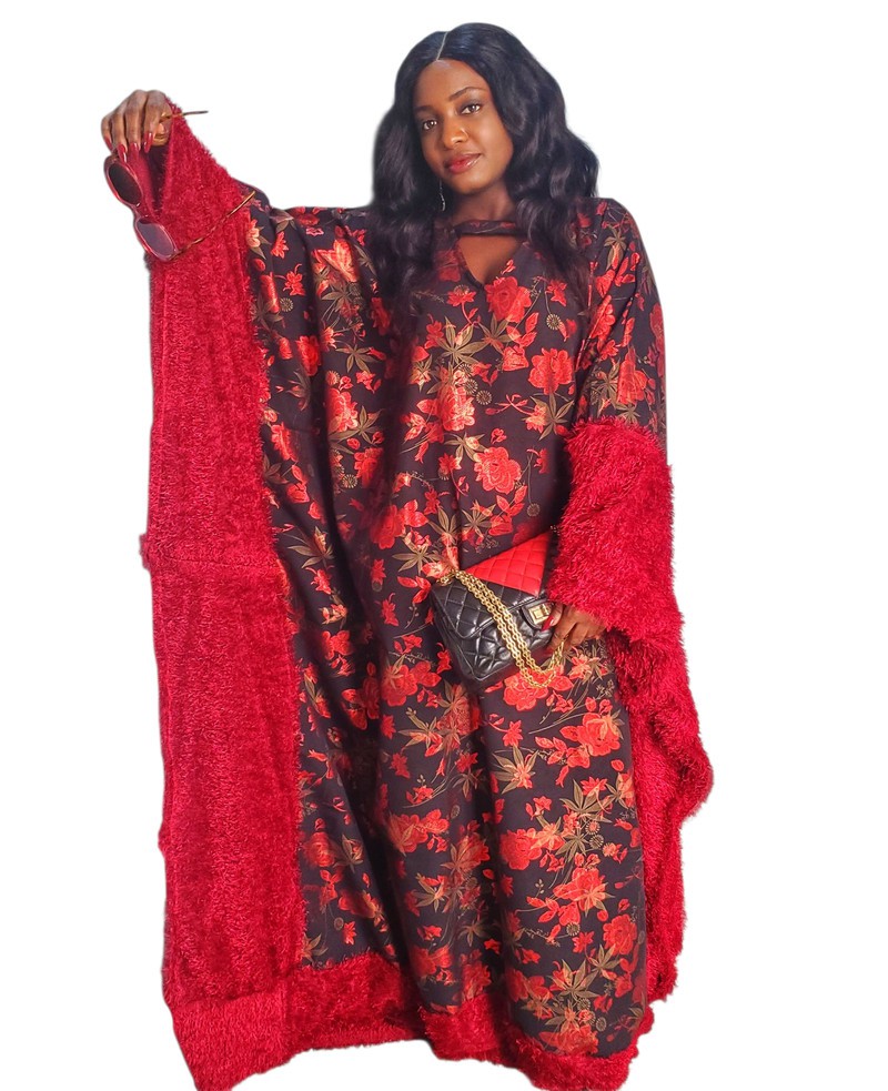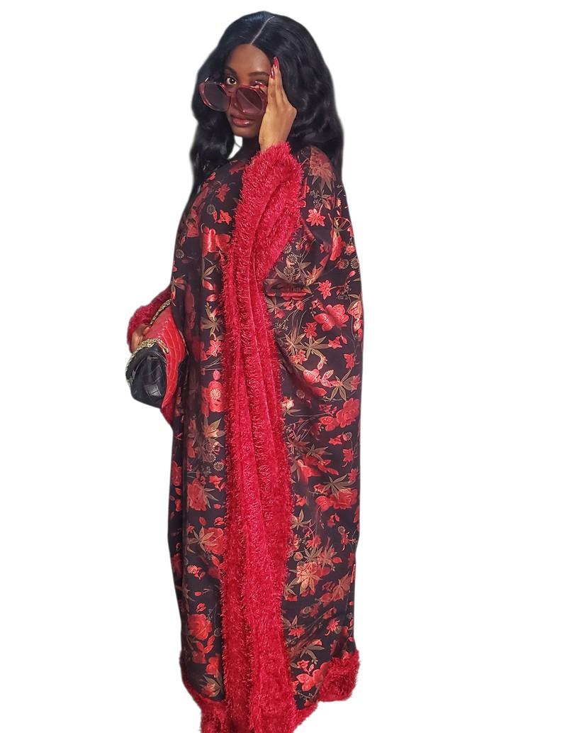 This piece is designed as a boubou. It is combined with fur fabric to give it a look of sophistication and glamour.