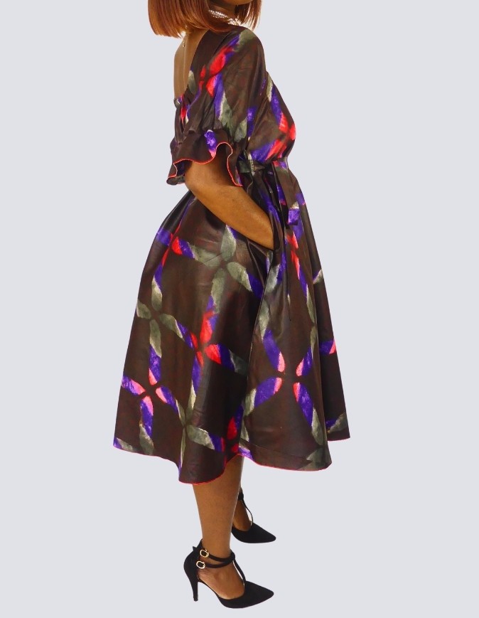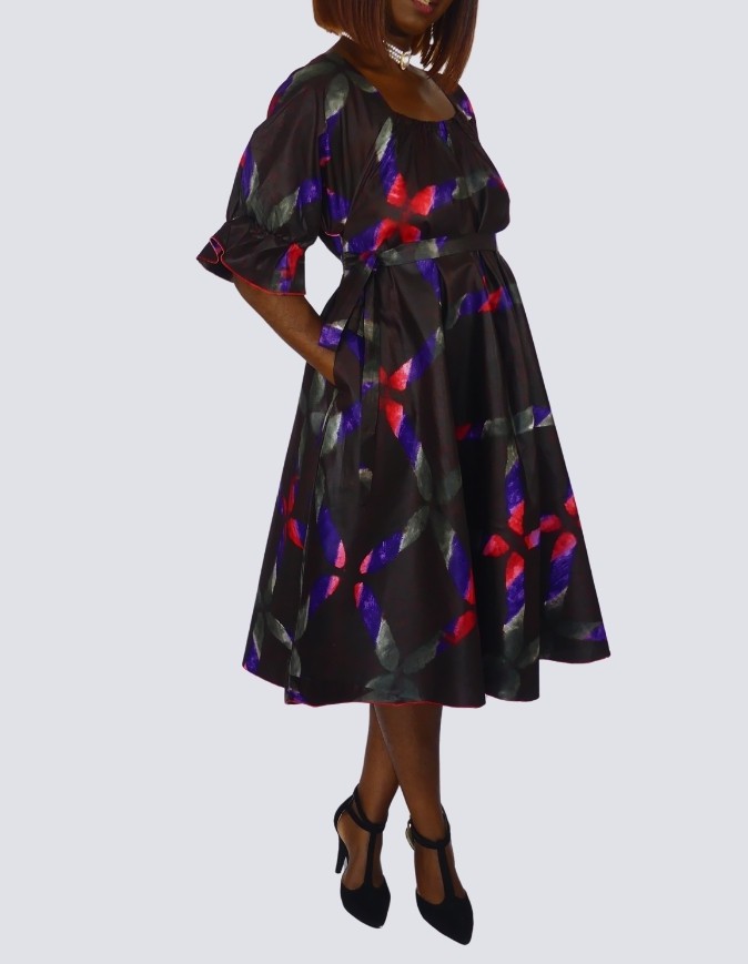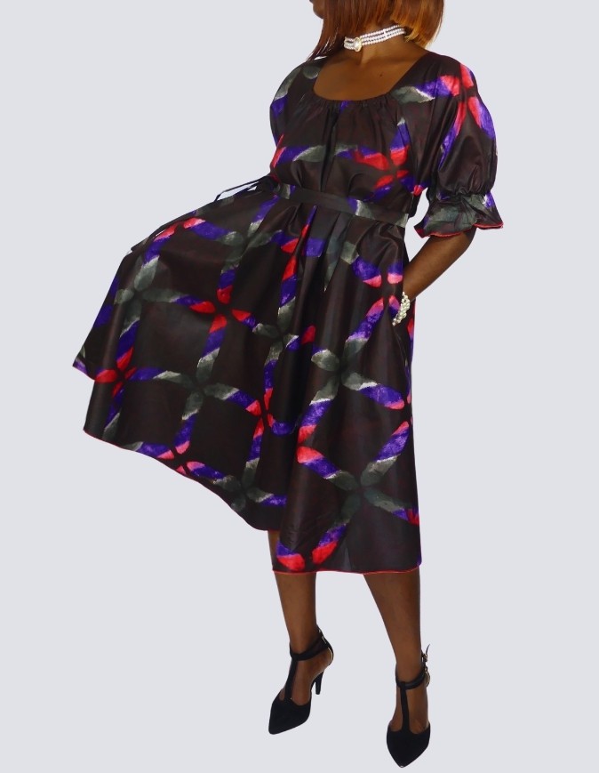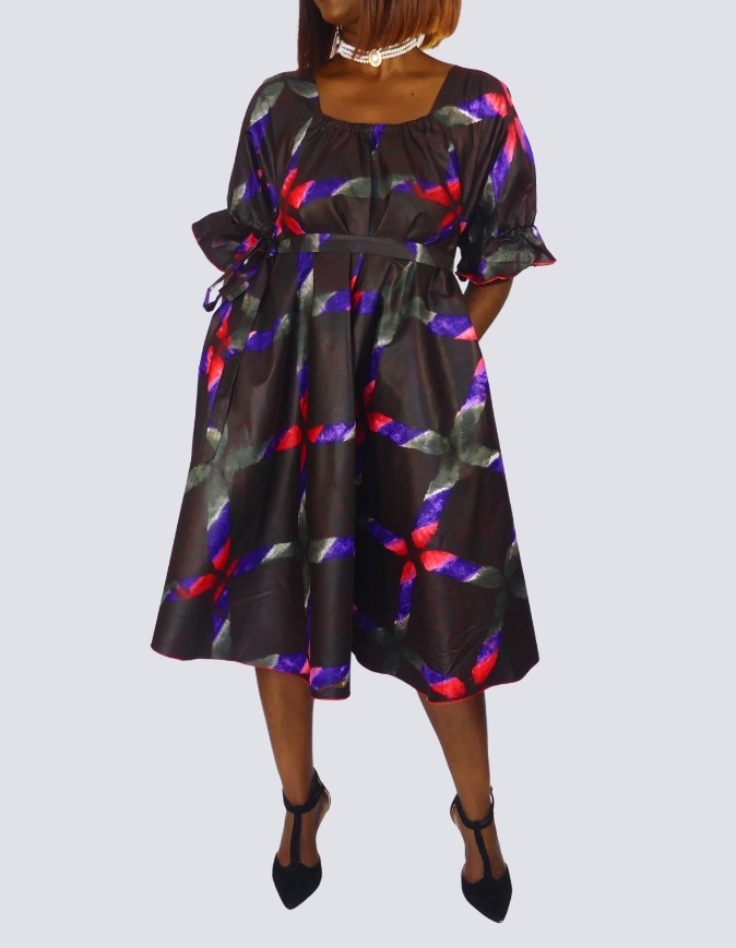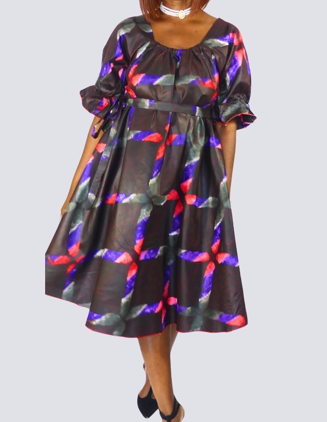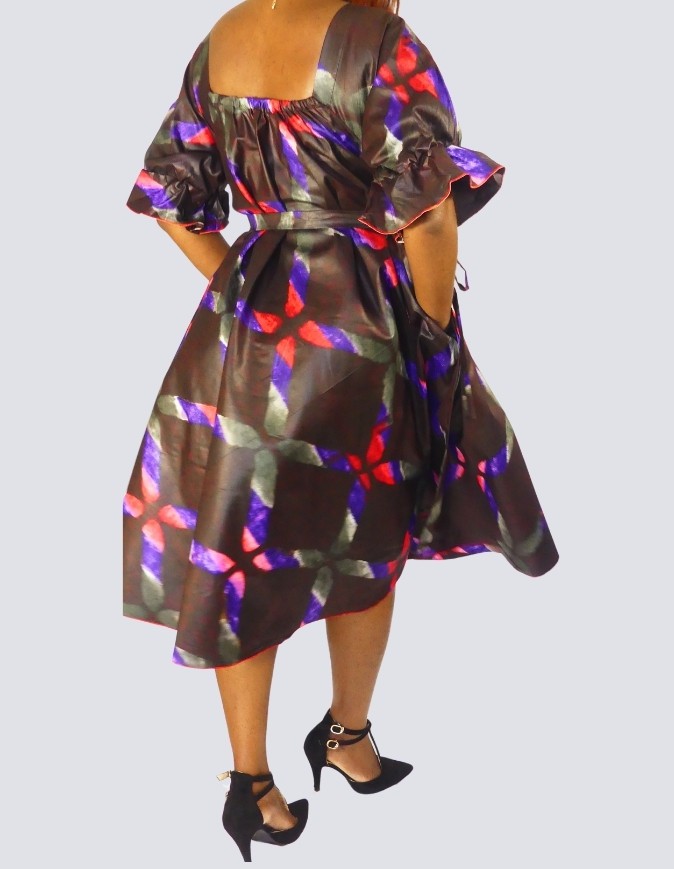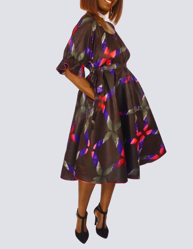 Très Jolie robe évasée imprimée en bazin mi-longue. Manches mi-longues, évasée, ce qui permet une meilleure aisance et la possibilité d’enfiler la robe quelque soit la taille. La robe est évasée, légère et Idéale pour l’été, se porte en toute occasion. Cordon à nouer autour de la taille.