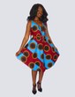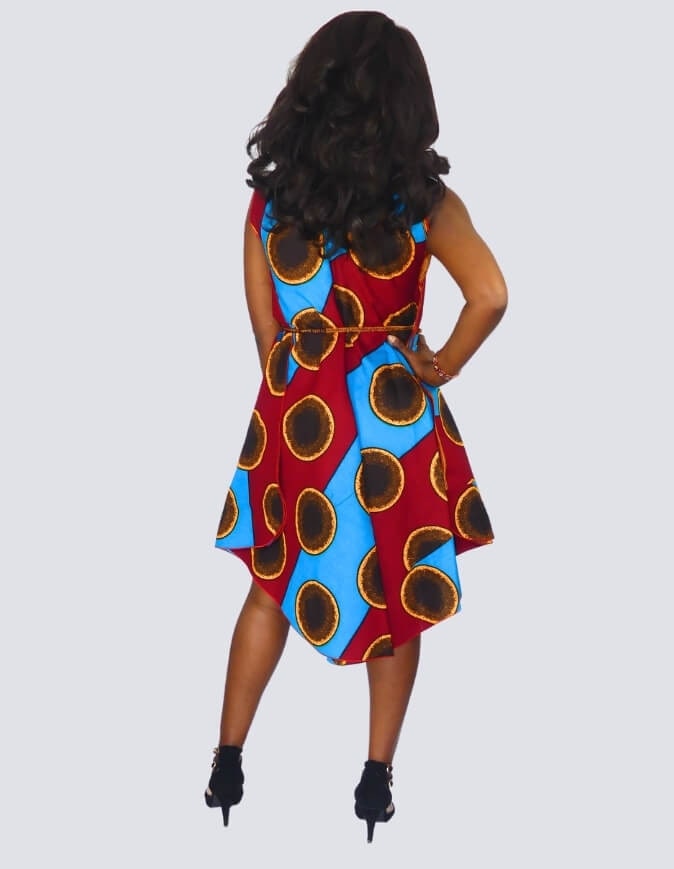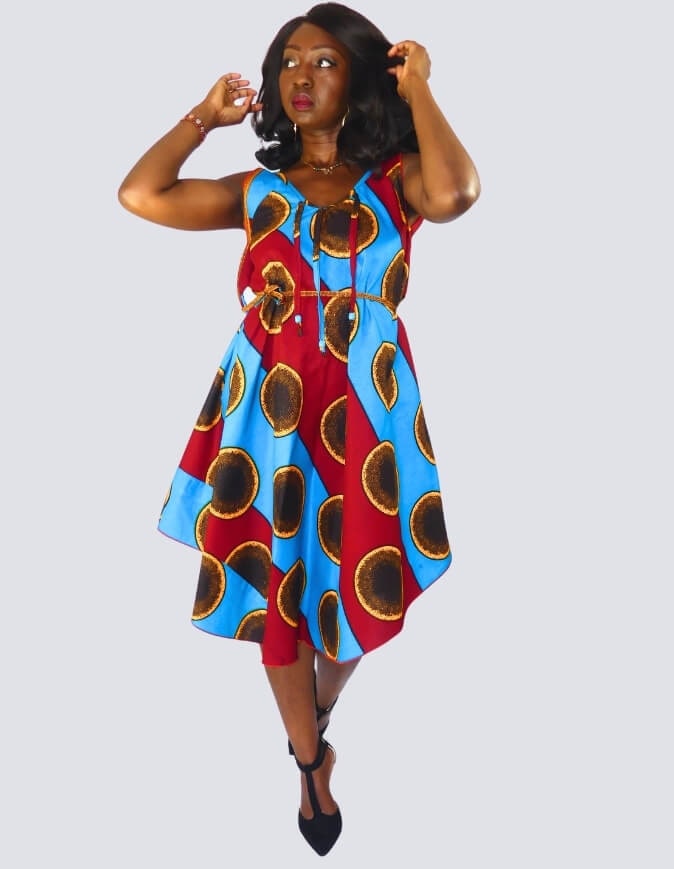Très Jolie robe évasée imprimée en wax mi-longue. Sans manches, évasée, ce qui permet une meilleure aisance et la possibilité d’enfiler la robe quelque soit la taille. La robe est évasée, légère et Idéale pour l’été, se porte en toute occasion. Cordon à nouer autour de la taille.