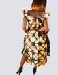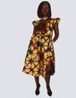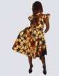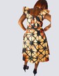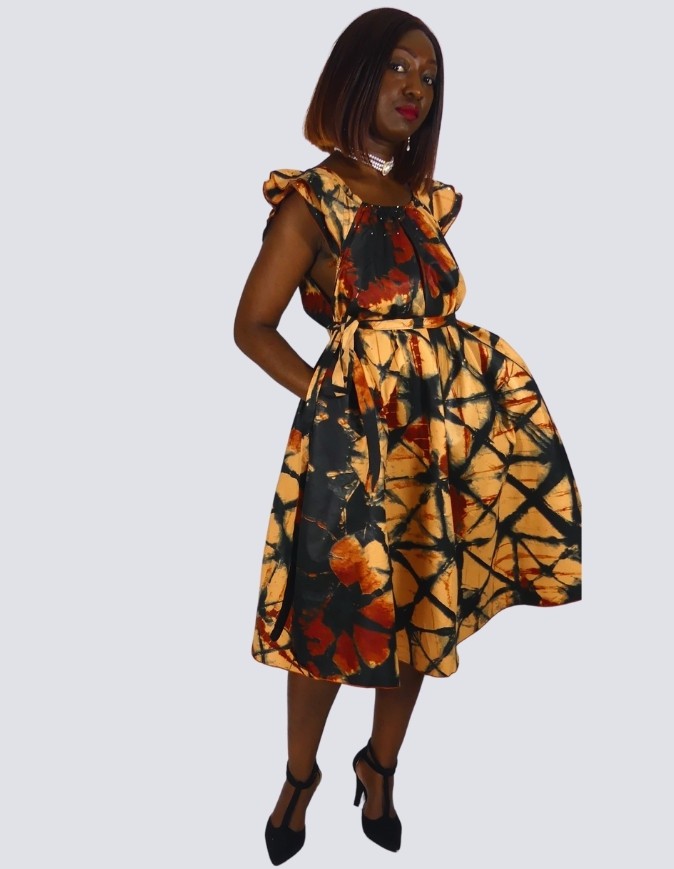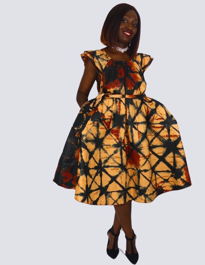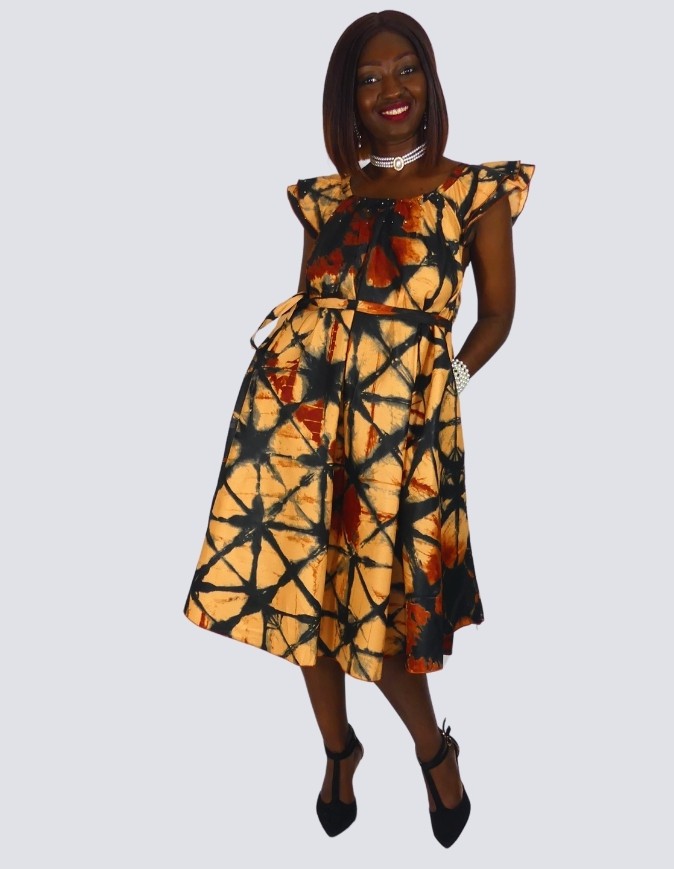 Très Jolie robe évasée imprimée en bazin mi-longue. Manches courtes, évasée, ce qui permet une meilleure aisance et la possibilité d’enfiler la robe quelque soit la taille. La robe est évasée, légère et Idéale pour l’été, se porte en toute occasion. Cordon à nouer autour de la taille.