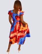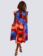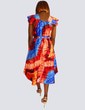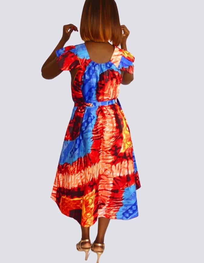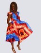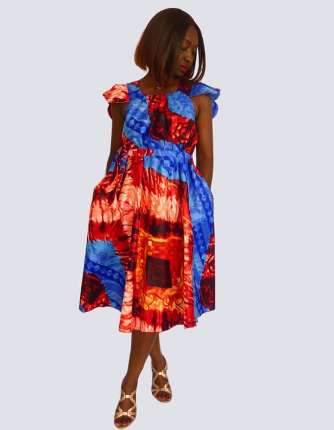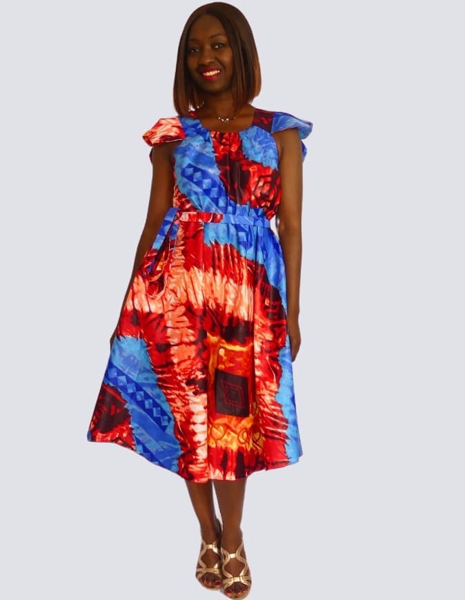 Très Jolie robe évasée imprimée en bazin mi-longue. Manches courtes, évasée, ce qui permet une meilleure aisance et la possibilité d’enfiler la robe quelque soit la taille. La robe est évasée, légère et Idéale pour l’été, se porte en toute occasion. Cordon à nouer autour de la taille.