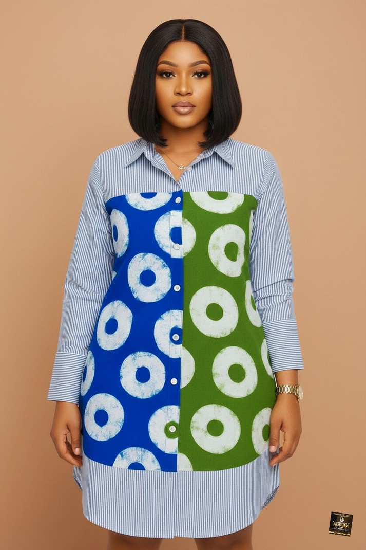 Radiate modern artistic charm in this vibrant mixed-media shirt dress, a standout piece that expertly combines classic tailoring with bold traditional motifs. The garment is crafted from a high-quality pinstriped cotton blend on the collar, yoke, and long sleeves, providing a crisp and professional base that contrasts beautifully with the central hand-dyed Adire cotton panels. Featuring a striking color-blocked front in deep cobalt blue and forest green each adorned with large ivory circular motifs, the dress is designed with a button-down front, a smart pointed collar, and a clean, curved hemline that offers a contemporary silhouette. This versatile piece is an ideal choice for creative professional settings, sophisticated art gallery openings, or chic weekend social gatherings, offering a polished and culturally-inspired look that pairs effortlessly with neutral pumps or minimalist loafers.
