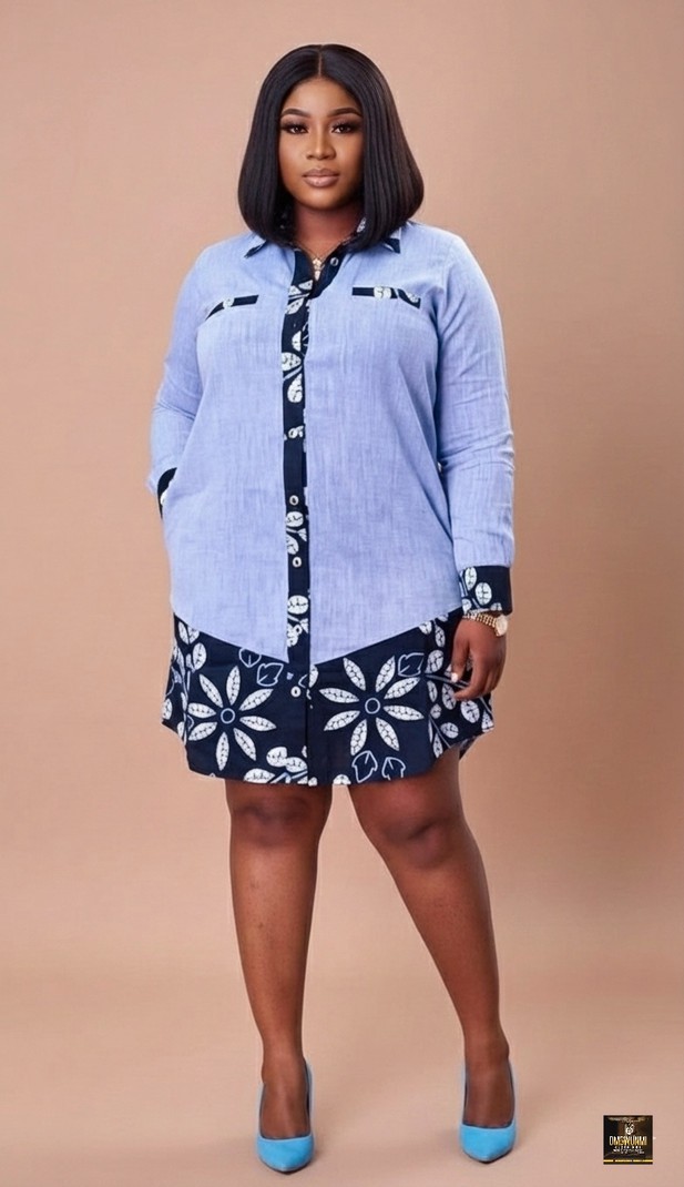 This sophisticated midi-length shirt dress is a masterful blend of modern corporate tailoring and traditional African artistry, featuring a unique mixed-media design that commands attention. The upper half is expertly tailored from a light blue textured cotton-linen blend, offering a crisp, professional feel, while the lower hem, cuffs, and button placket are accented with a rich navy blue and white floral Adire print. The dress features a classic pointed collar, functional chest pockets with Adire trim, and a curved, feminine hemline that creates a flattering silhouette. This versatile piece is an ideal choice for creative office environments, high-level business lunches, or sophisticated weekend social gatherings, providing a look of refined, culturally-conscious elegance when paired with classic pumps.
