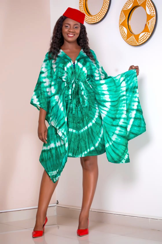 mini satin boubou printed batik with rope at the waist to allow you to loosen or tighten it at your convenience. low-cut and really easy to wear.