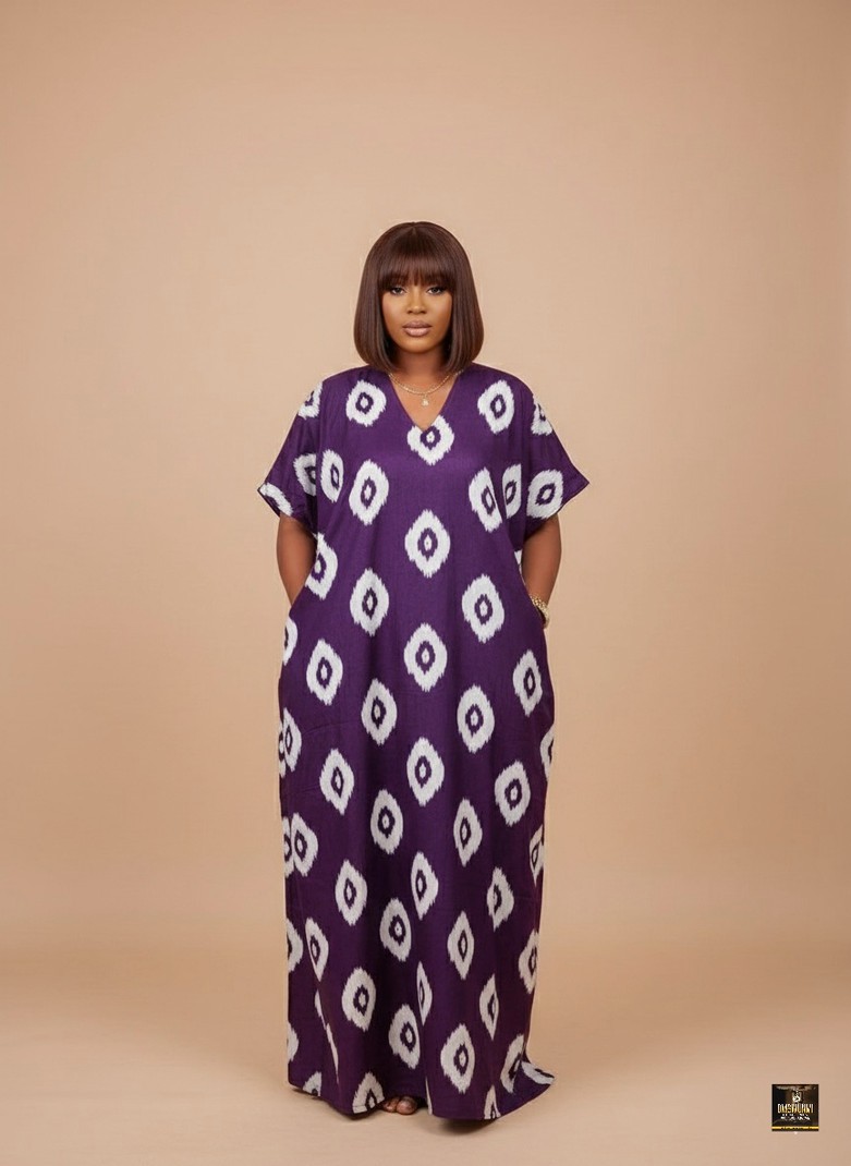 Make a regal and artistic statement in this stunning maxi boubou gown, a masterful showcase of traditional textile heritage reimagined for the modern woman. The garment is meticulously handcrafted from premium purple hand-dyed Adire cotton, featuring a striking "eye" or diamond motif in crisp white that creates a mesmerizing, rhythmic visual across the entire silhouette. Designed with an emphasis on both comfort and presence, the gown features a classic V-neckline, practical side pockets, and a relaxed, flowing cut that drapes beautifully to the floor. This breathable and culturally rich ensemble is the ideal choice for high-profile traditional weddings, exclusive art exhibitions, or elegant evening receptions where you want to project a sophisticated and authoritative sense of style.