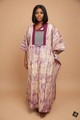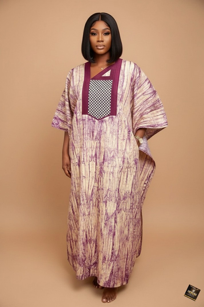 This ethereal floor-length kaftan is a stunning example of understated luxury, featuring a delicate lavender and cream tie-dye pattern that creates a soft, marbled effect across the entire silhouette. Expertly crafted from premium, high-quality polished cotton, the fabric provides a smooth, breathable texture and a graceful drape that ensures both maximum comfort and a regal presence. The gown is anchored by a unique, structured neckline featuring a rich magenta border and a distinctive black-and-white checkered central panel, adding a modern, graphic contrast to the organic flow of the batik-inspired print. This majestic piece is an ideal choice for grand cultural celebrations, upscale garden parties, or as a high-fashion statement for formal holiday gatherings where you want to radiate effortless elegance and unique style.