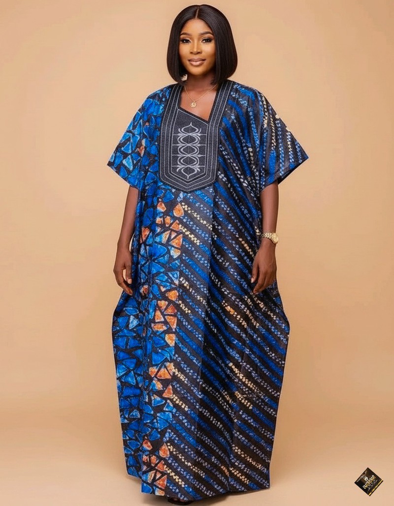 This magnificent floor-length kaftan is a stunning showcase of contemporary African artistry, featuring a dynamic split-design that combines an intricate blue mosaic pattern with sharp, diagonal indigo and gold stippled stripes. Expertly tailored from a premium, high-quality polished cotton, the fabric provides a subtle, sophisticated sheen and a structured yet breathable drape that ensures a regal silhouette and maximum comfort. The gown is anchored by a beautifully detailed, dark grey embroidered neckline panel featuring traditional-inspired silver motifs that add a layer of texture and focus to the piece. This kaftan is the perfect choice for high-profile cultural festivals, upscale evening receptions, or as a distinguished ensemble for a formal holiday celebration where you want to radiate grace and cultural pride.