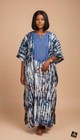 This striking floor-length kaftan is a masterpiece of textile artistry, featuring a rich, blue batik-inspired print with complex splatters of burgundy, off-white, and deep charcoal. Meticulously crafted from premium, high-quality polished cotton, the fabric provides a structured yet breathable drape that offers a subtle, luxurious sheen and feels exceptionally soft against the skin. The garment is elevated by a vibrant blue geometric embroidered neckline that serves as a bold focal point. This majestic piece is an ideal choice for high-profile cultural festivals, elegant garden parties, or as a statement gown for formal evening receptions where you want to radiate effortless grace and artistic flair.
